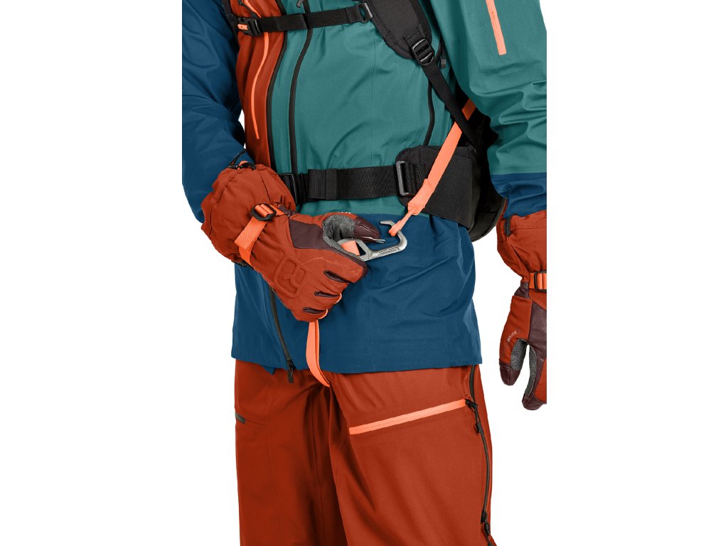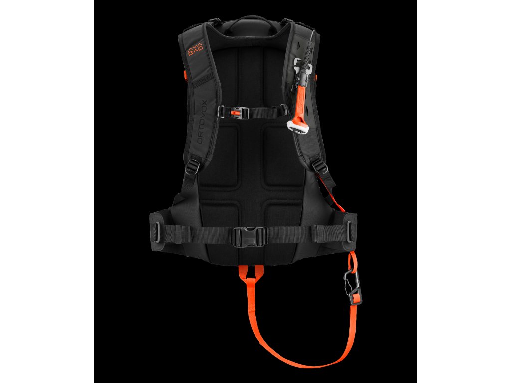 Pojistný popruh mezi nohama je proveden ve svítivě oranžové barvě, pro rychlou a jasnou kontrolu správného zajištění před sjezdem. Účelem popruhu je zabránit strhnutí batohu z těla v jedoucí lavině. Díky provedení pojistného popruhu může být přezka bederního popruhu pohodlně zacvakávací, jako je u nelavinových batohů běžné. Zacvakávací přeska bederáku tak zásadně zvyšuje uživatelský komfort, hlavně při rychlém rozepínání před nástupem na lanovku.
