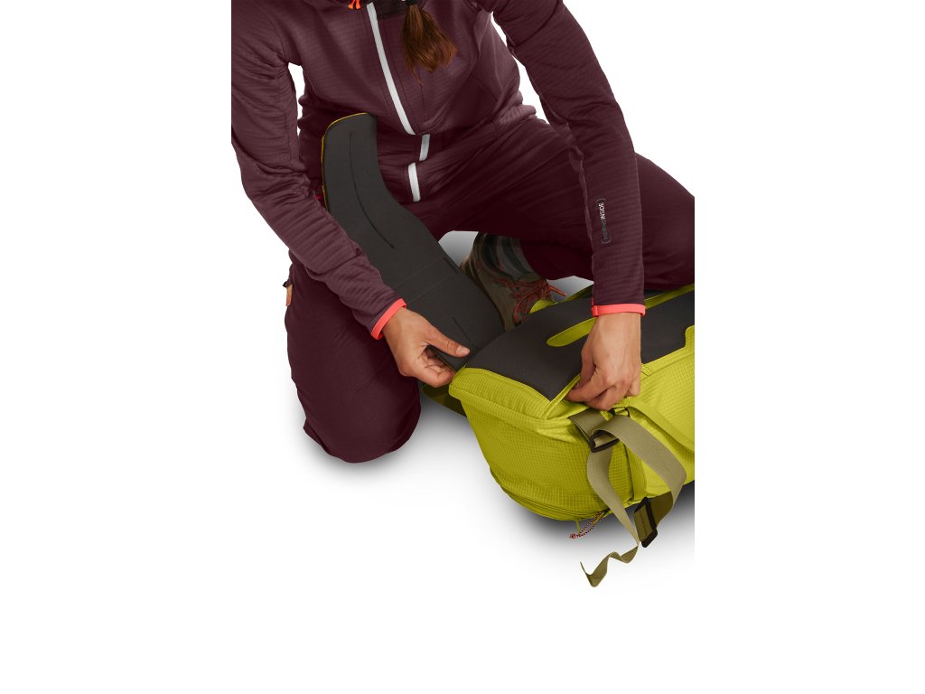 Batoh ORTOVOX TRAD 33 S pevně drží na zádech a díky střihu a umístění bederního popruhu s odnímatelným polstrováním se ti nebude krýt s lezeckým úvazkem. I výška batohu je nastavena pro volné zaklonění hlavy i s přilbou. Vycpané ramenní popruhy, odlehčený bederní pás a nastavitelný hrudní popruh s píšťalkou. To vše má za výsledek skvělý komfort.