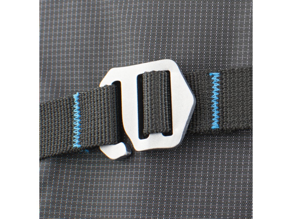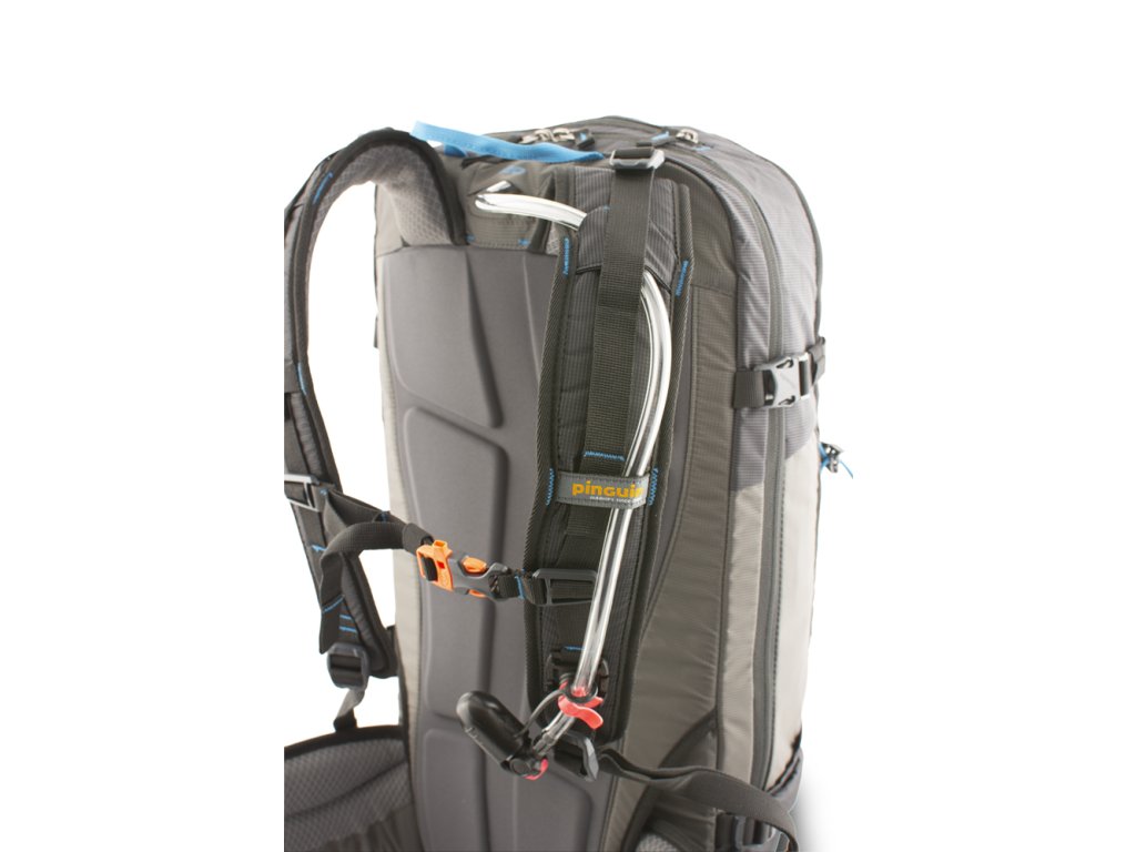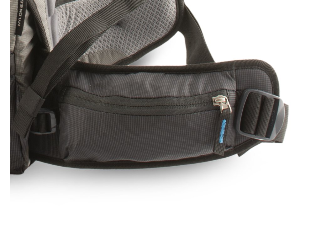 Zipová kapsa na pravé straně bederního pásu, poutko na karabiny nebo lyžařské mačky na jeho levé straně.