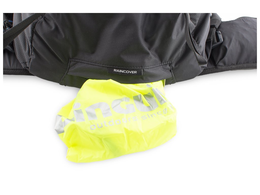 Výrazná pláštěnka v samostatné zipové kapse na dně batohu.