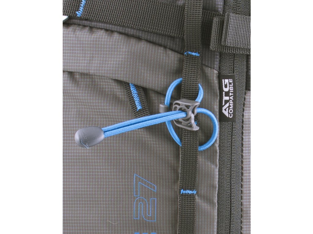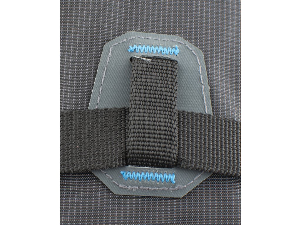 Odolné kovové háčky a Hypalonem podložená poutka na čele batohu k diagonální fixaci lyží.