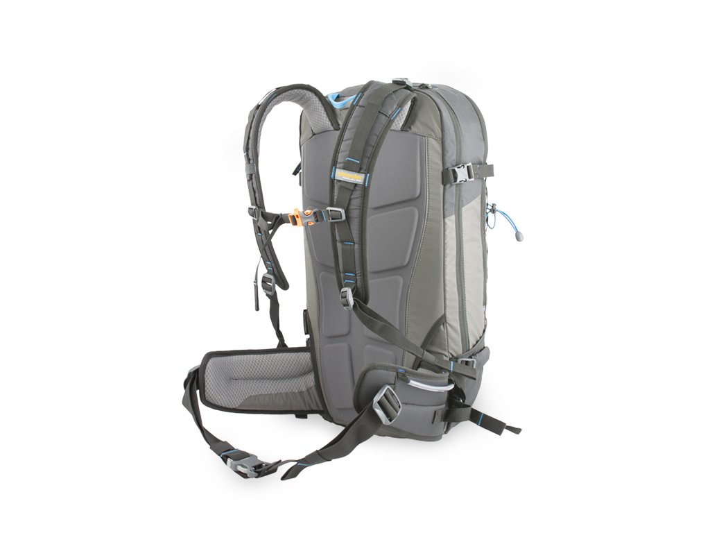 Široká záda batohu jsou vyztužena vyjímatelnou HDPE deskou s integrovanou duralovou výztuží, která pomáhá rozložit hmotnost přepravovaného nákladu na záda a eliminuje tlaky přepravovaných předmětů do zad.