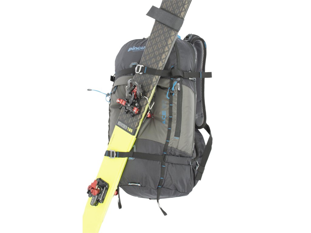 Možnost čelní fixace snowboardu nebo sněžnic horizontálními popruhy.