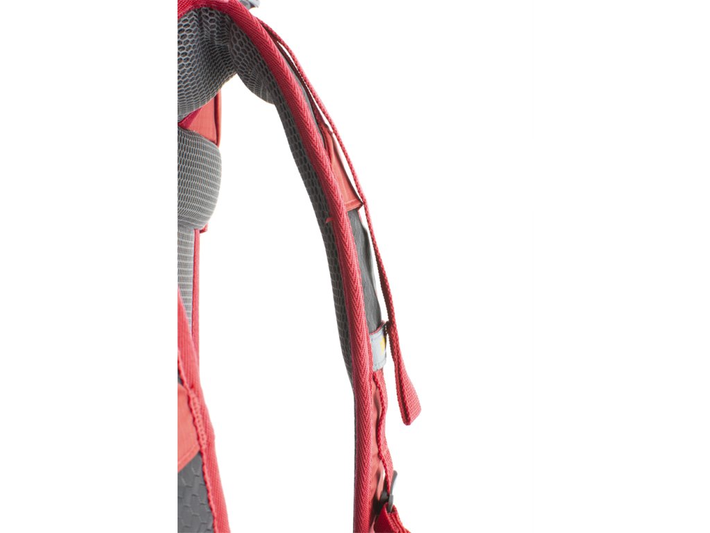 Výškově nastavitelný a odepínatelný hrudní popruh s píšťalkou pro případ nouze.