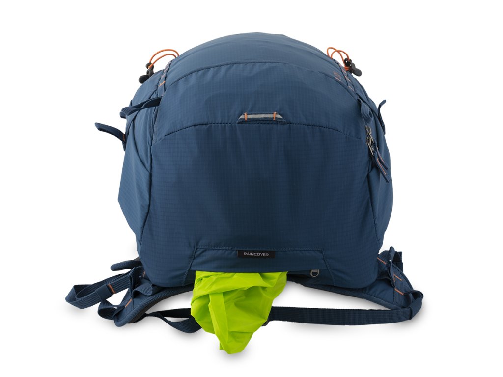 Výrazná pláštěnka v samostatné zipové kapse na dně batohu. Umístění kapsy umožňuje využít kapsu pro transport pouzdra na nářadí.