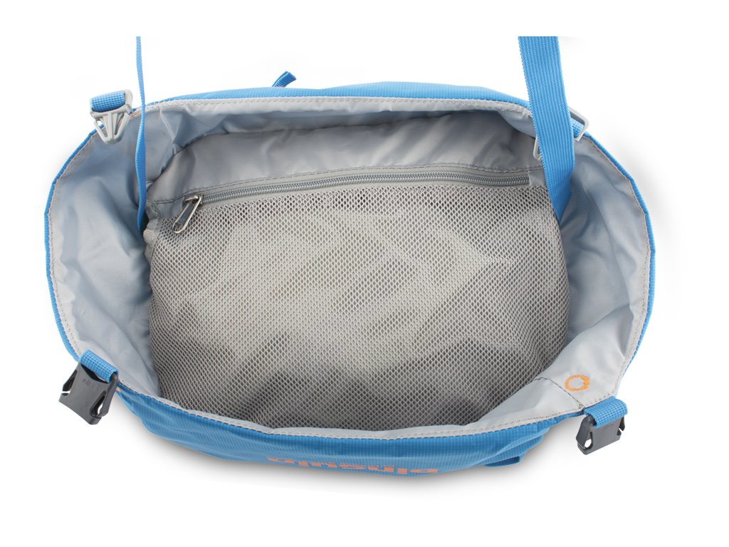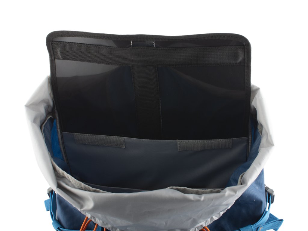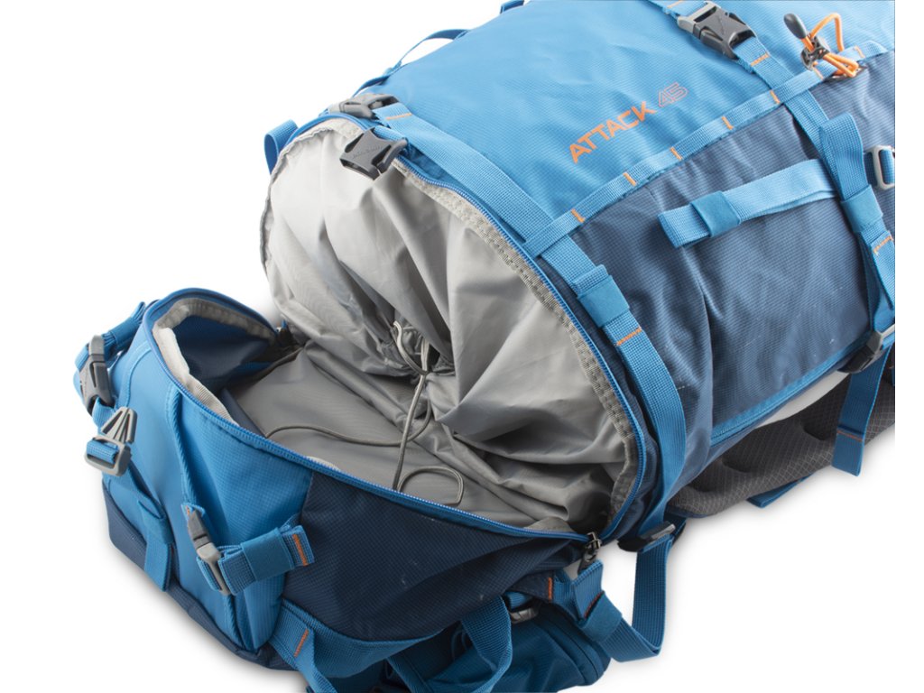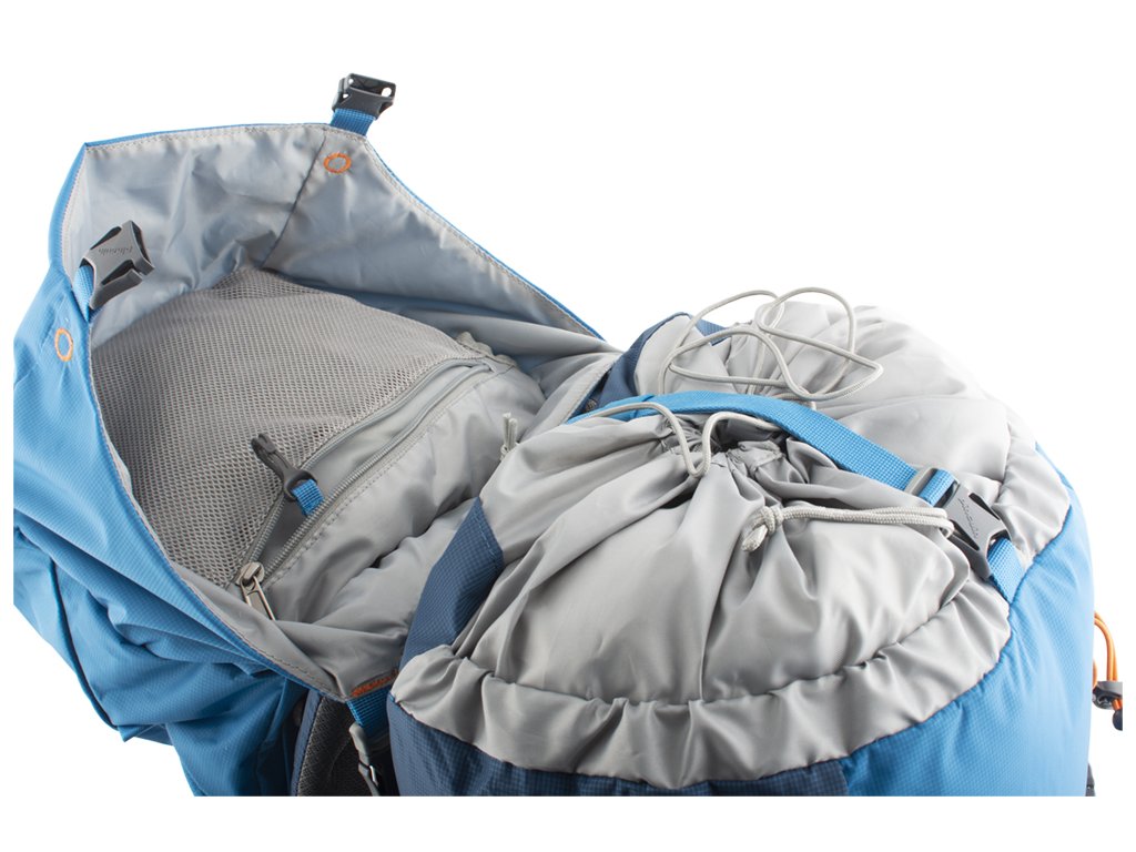 Dvě komory pro oddělení přepravovaného vybavení podle četnosti jeho používání, možnost propojení obou komor v jednu rozepnutím přepážky. Snadno odepínatelné prostorné víko batohu se dá použít jako ledvinka nebo taška přes rameno. Vnější zipová kapsa na víku vhodná k uložení rychle dostupného vybavení (např. lékárny) a potravy. Síťovaná zipová kapsa na vnitřní straně víka na cennosti s karabinkou na klíče. Středový kompresní popruh pod víkem vhodný k fixaci lana. Přepážka oddělující vodní vak od dalšího převáženého vybavení uvnitř hlavní komory. Zip spodní komory je jištěn samostatným popruhem se sponou.