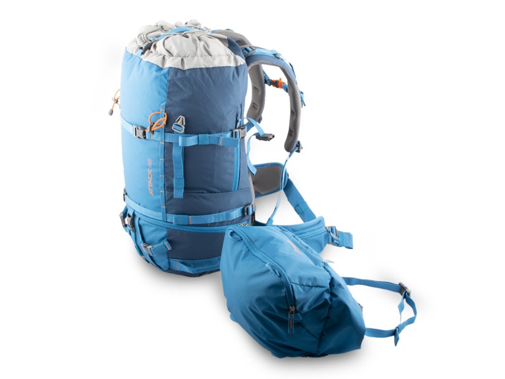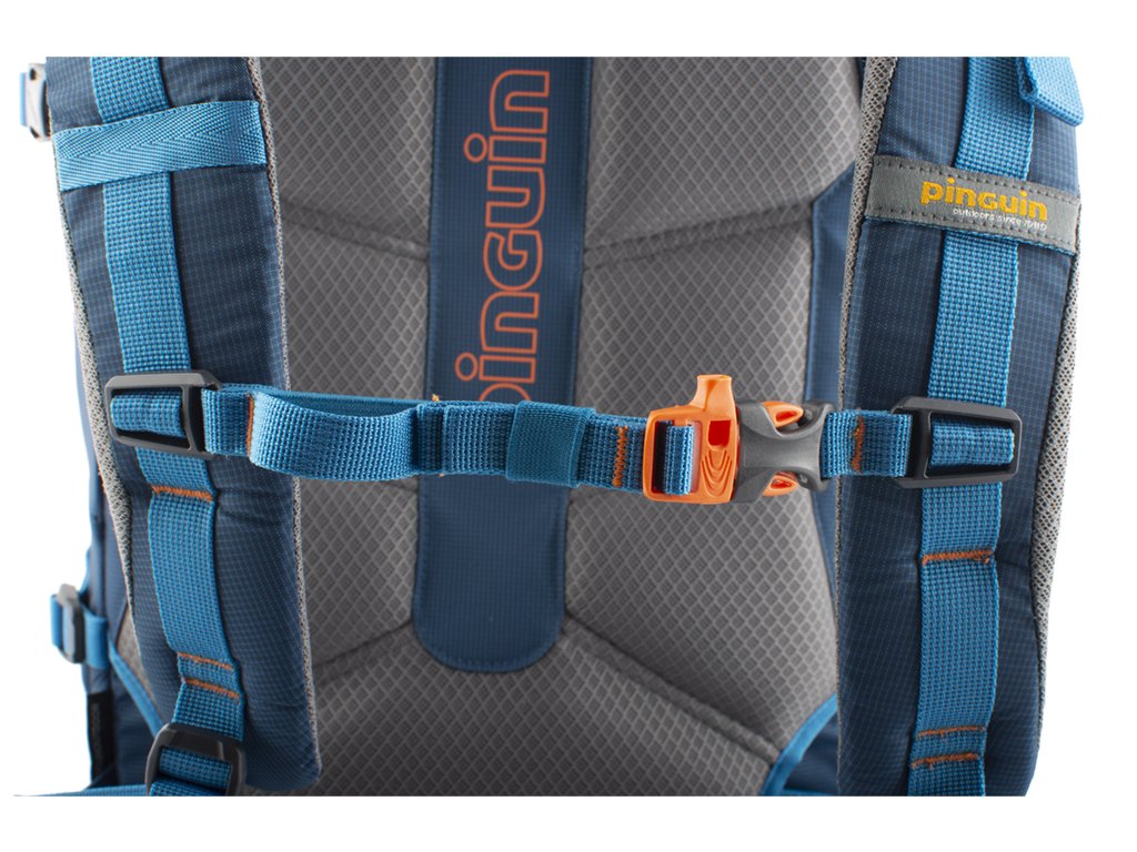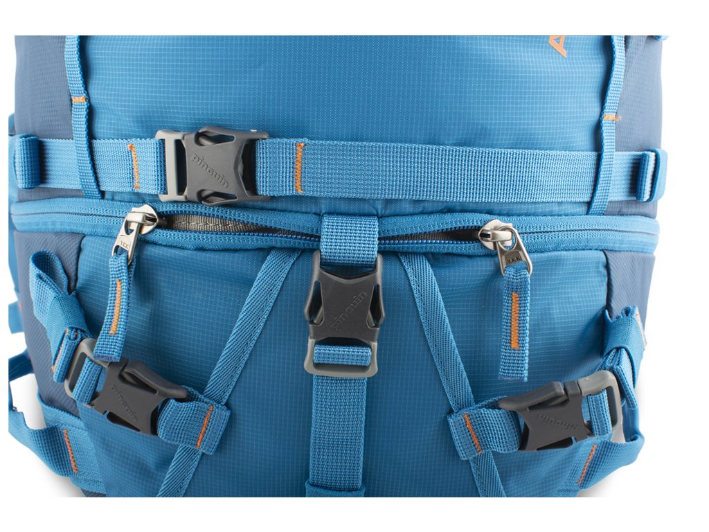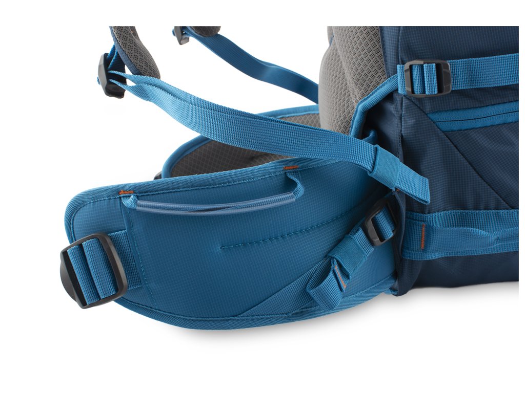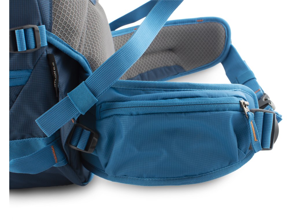 Výškově nastavitelný a odepínatelný hrudní popruh s píšťalkou pro případ nouze. Boční zipový vstup do batohu jištěný popruhem = snadný přístup k lahvi, rukavicím či bundě. Zipová kapsa na pravé straně bederního pásu. Poutko na karabiny nebo lyžařské mačky na jeho levé straně. Propojení bočních kompresních popruhů s čelním v jeden souvislý popruh přispívá k možnosti dokonalého stažení batohu a přitažení nákladu k zádovému systému a podporuje pohyblivost při chůzi s naloženým batohem. Odepínatelný bederní pás pomáhá efektivně rozložit hmotnost přenášeného nákladu mezi boky a záda.
