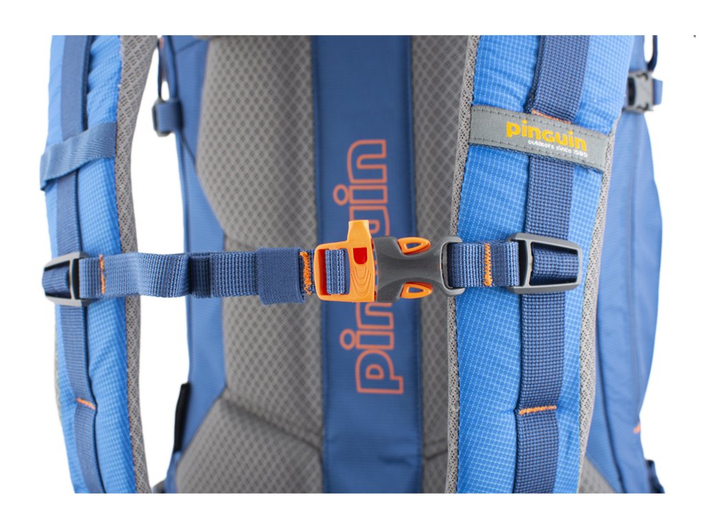 Výškově nastavitelný a odepínatelný hrudní popruh s píšťalkou pro případ nouze.