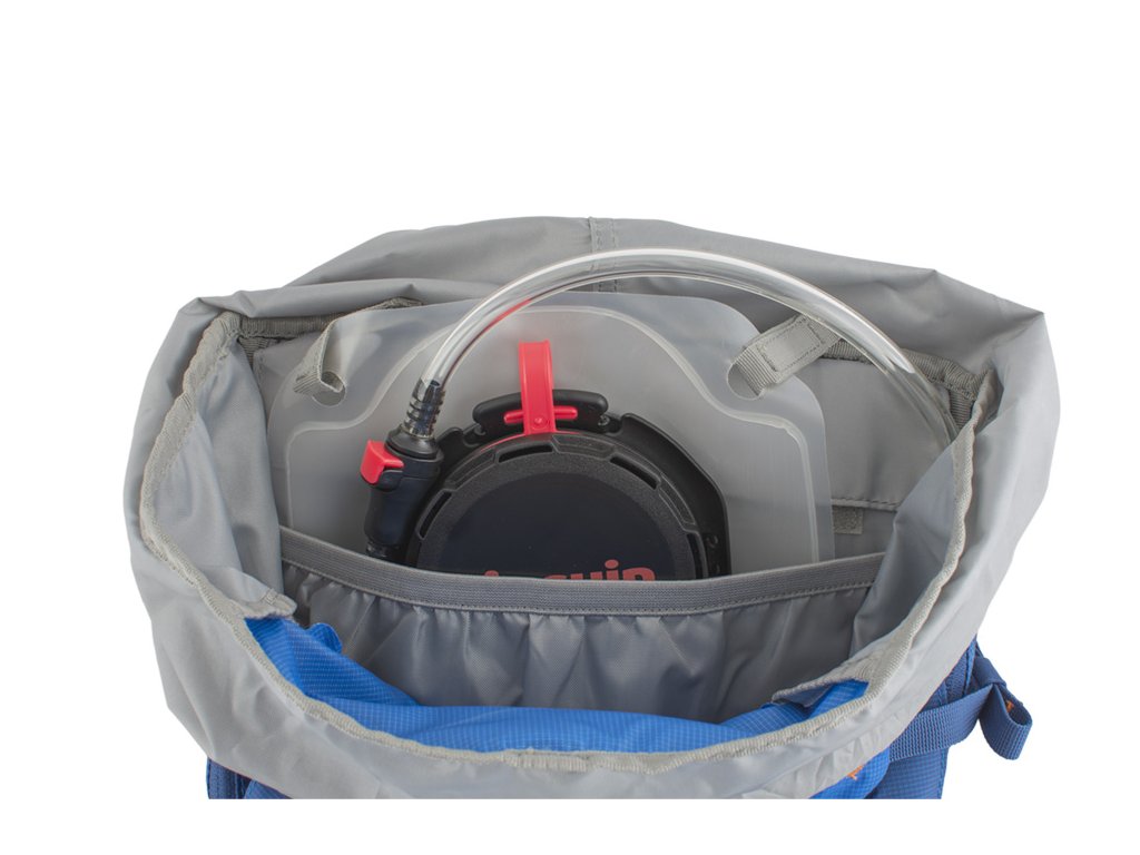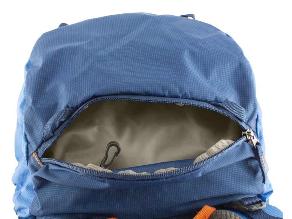 Středový kompresní popruh pod víkem. Vnější zipová kapsa na víku vhodná k uložení rychle dostupného vybavení (např. lékárny) a potravy.