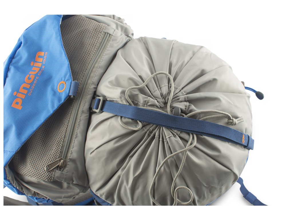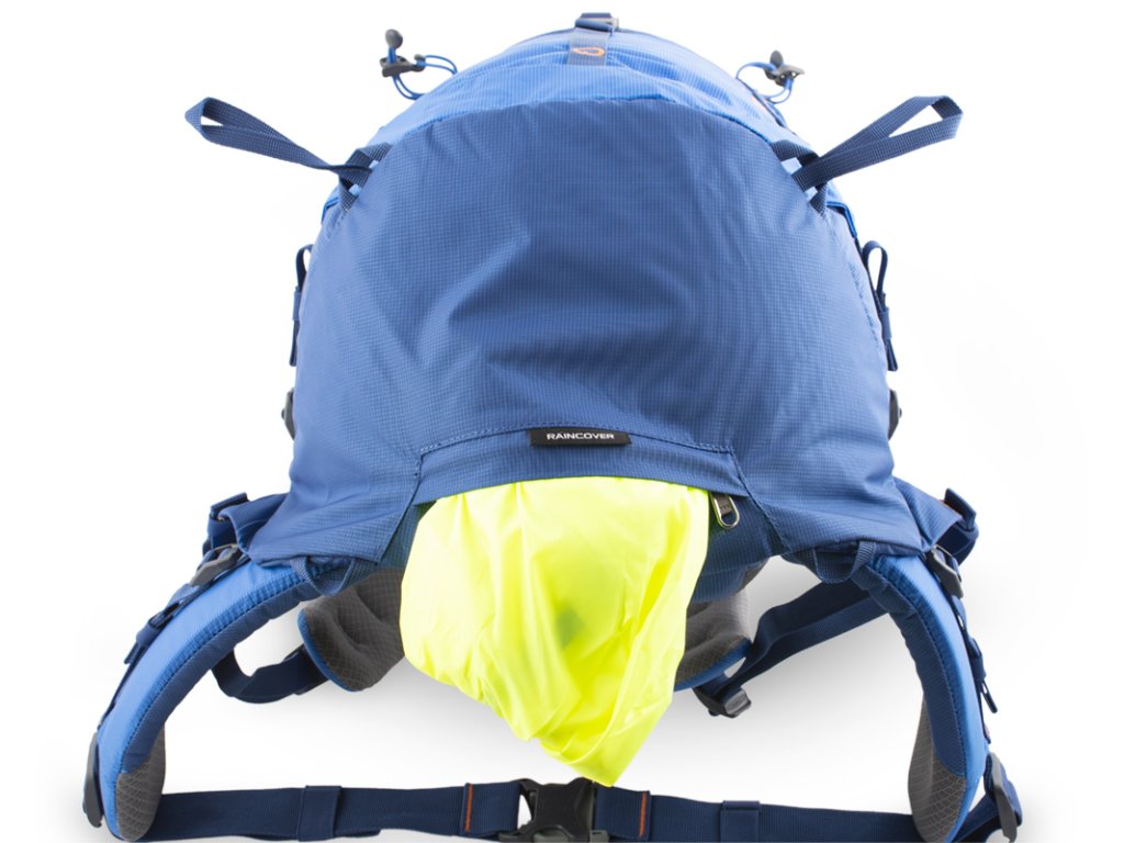 Výrazná pláštěnka v samostatné zipové kapse na dně batohu.