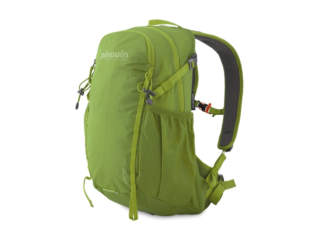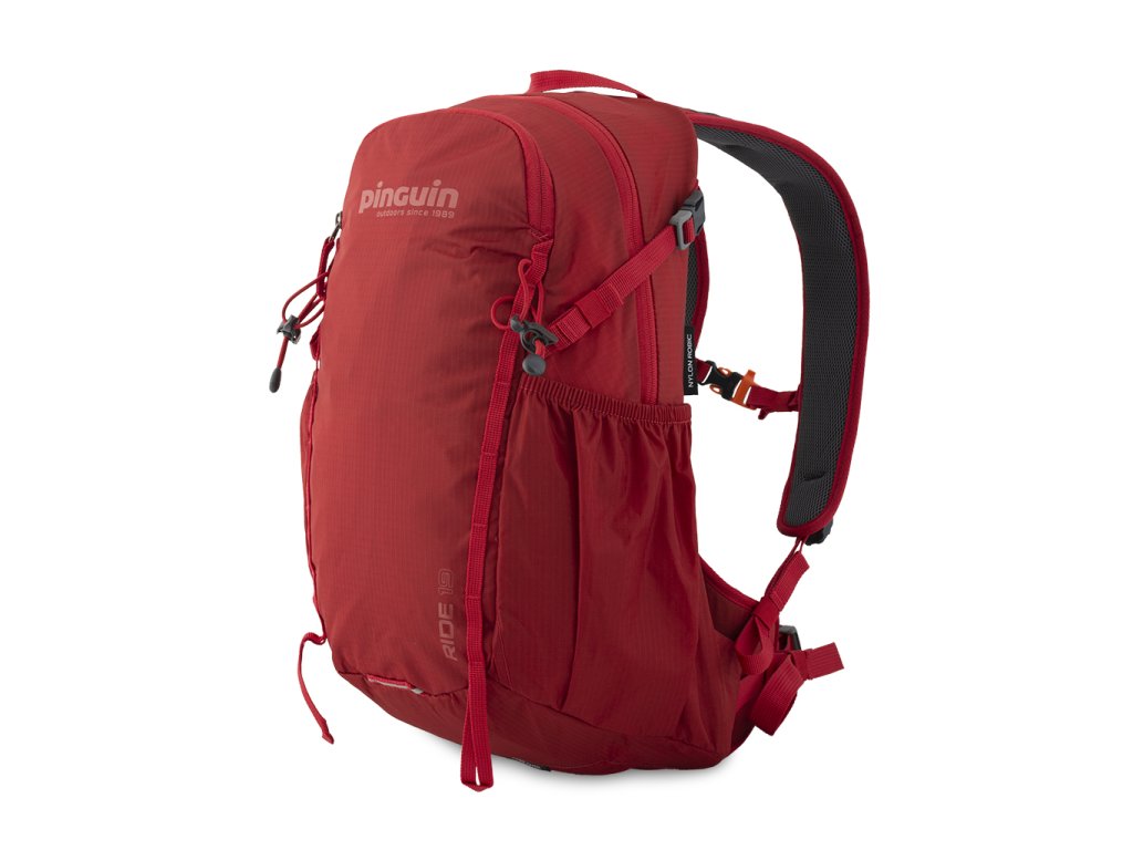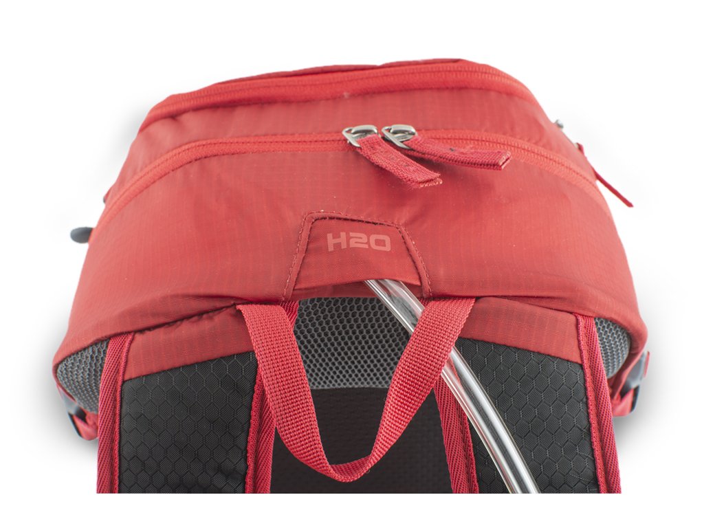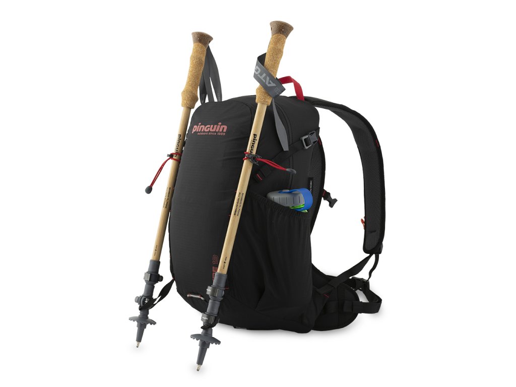 Pružná poutka s háčky na připevnění teleskopických holí a poutka na dně batohu. Boční síťované kapsy na lahve.