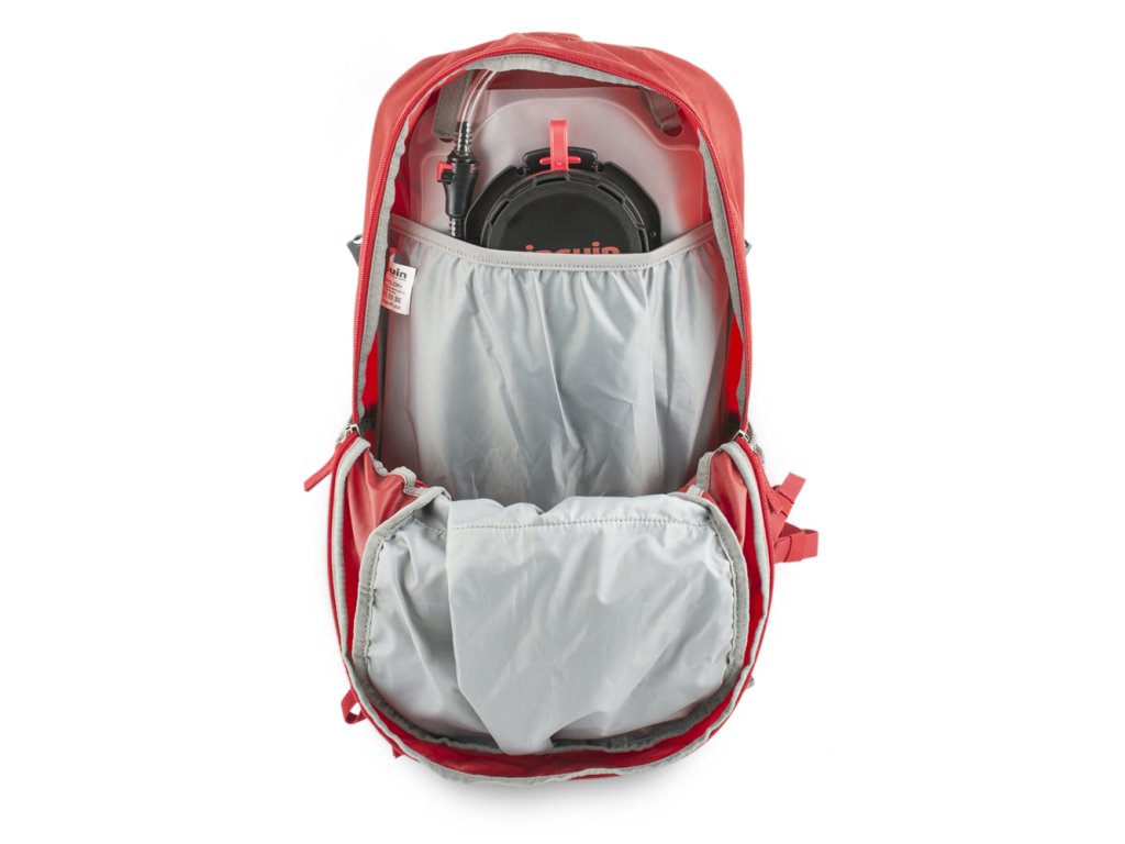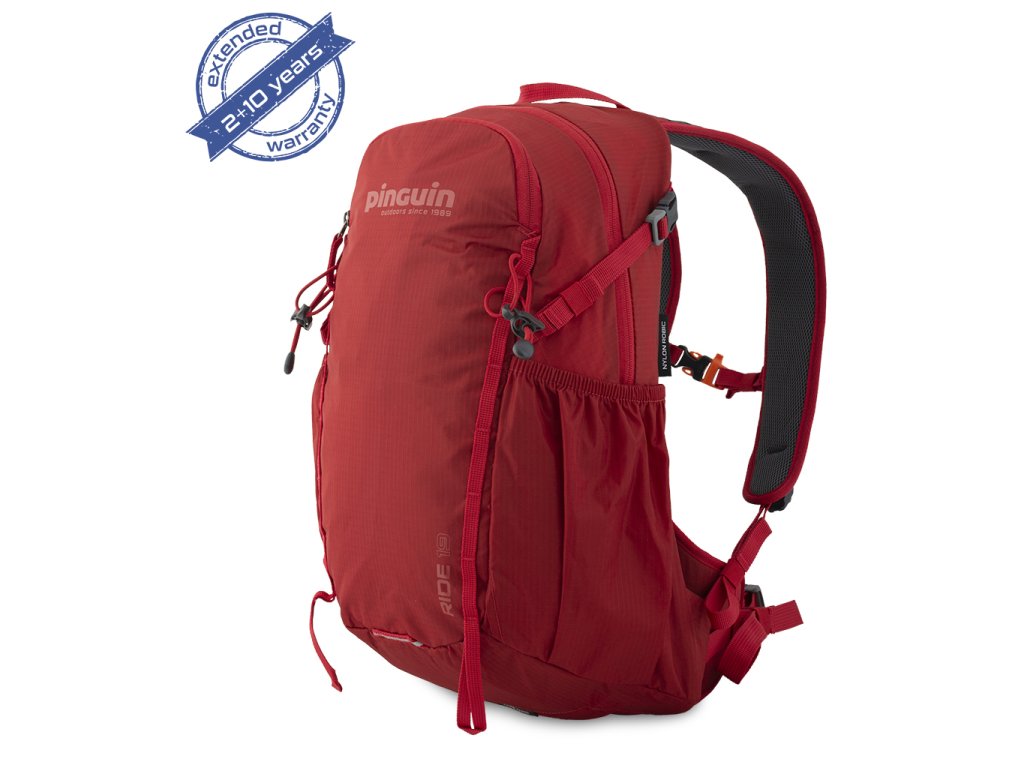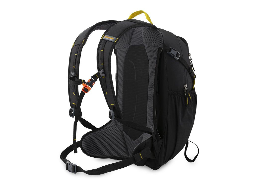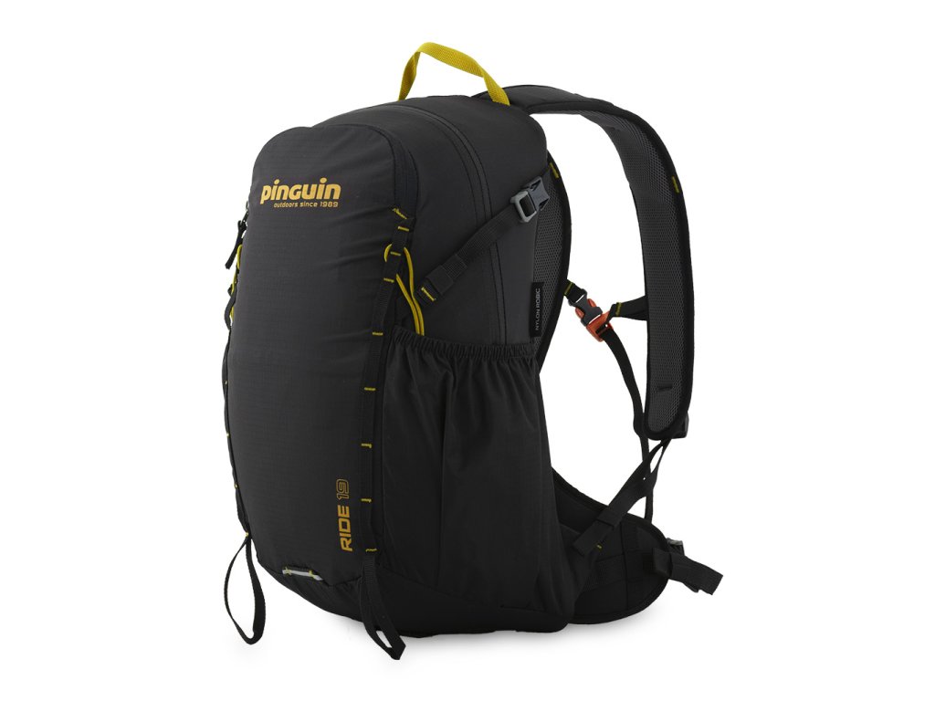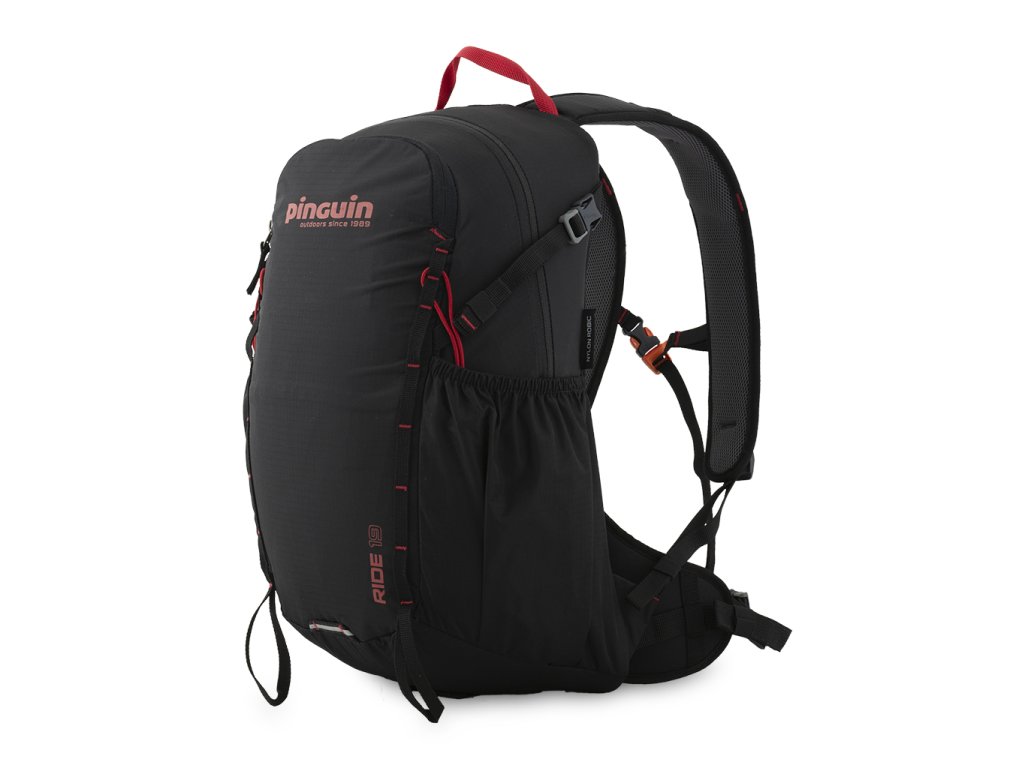 Pružná poutka s háčky na připevnění teleskopických holí a poutka na dně batohu. Boční síťované kapsy na lahve.