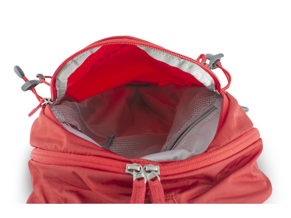 Prostorná čelní zipová kapsa s vnitřní síťovanou zipovou kapsou na cennosti s karabinkou na klíče.