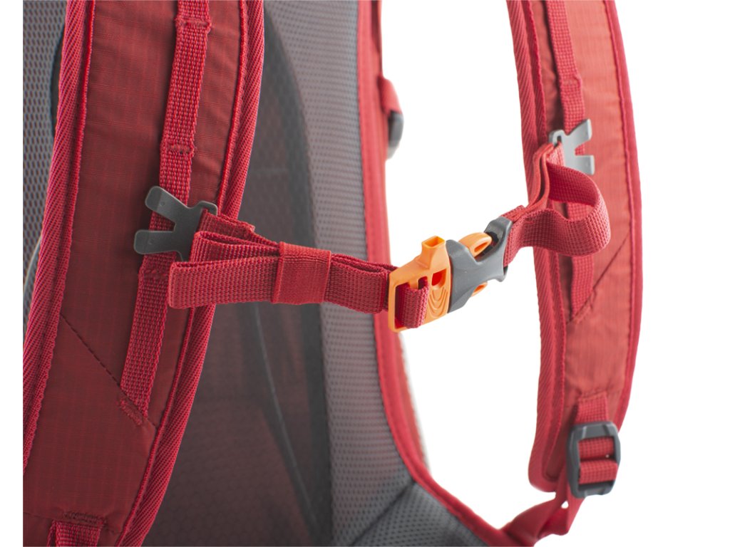 Výškově nastavitelný a odepínatelný hrudní popruh s píšťalkou pro případ nouze.
