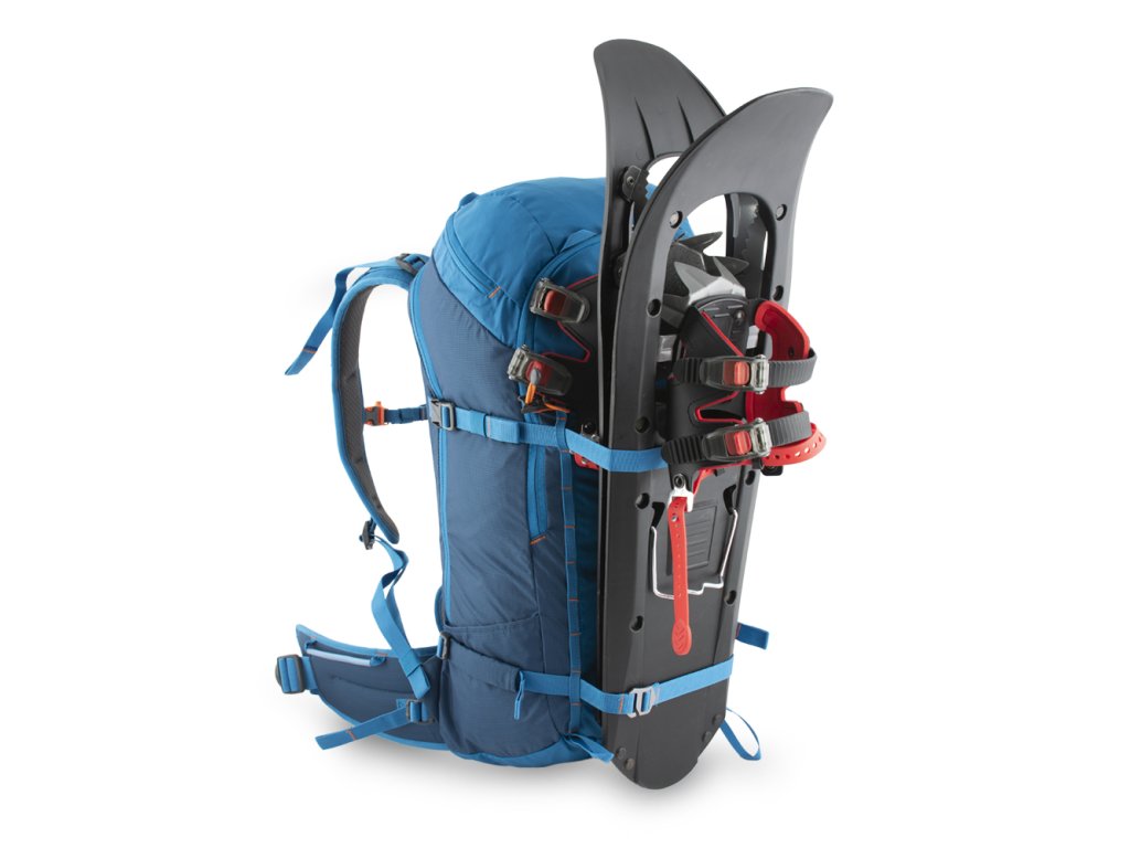 - Možnost čelní fixace snowboardu nebo sněžnic horizontálními popruhy.