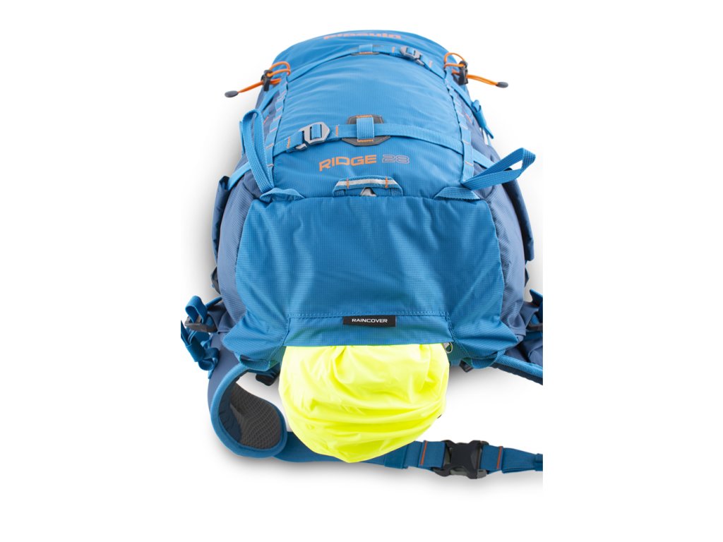 - Výrazná pláštěnka v samostatné zipové kapse na dně batohu.