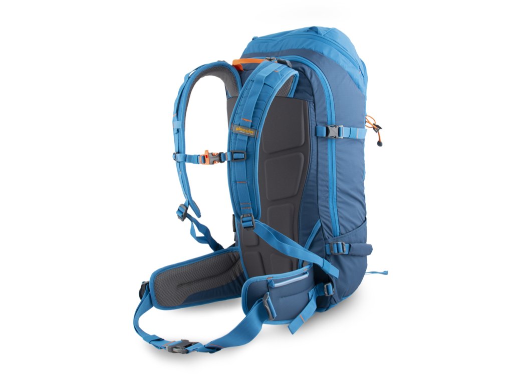 - Odolné kovové háčky a Hypalonem podložená poutka na čele batohu k diagonální fixaci lyží.