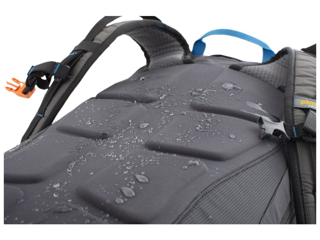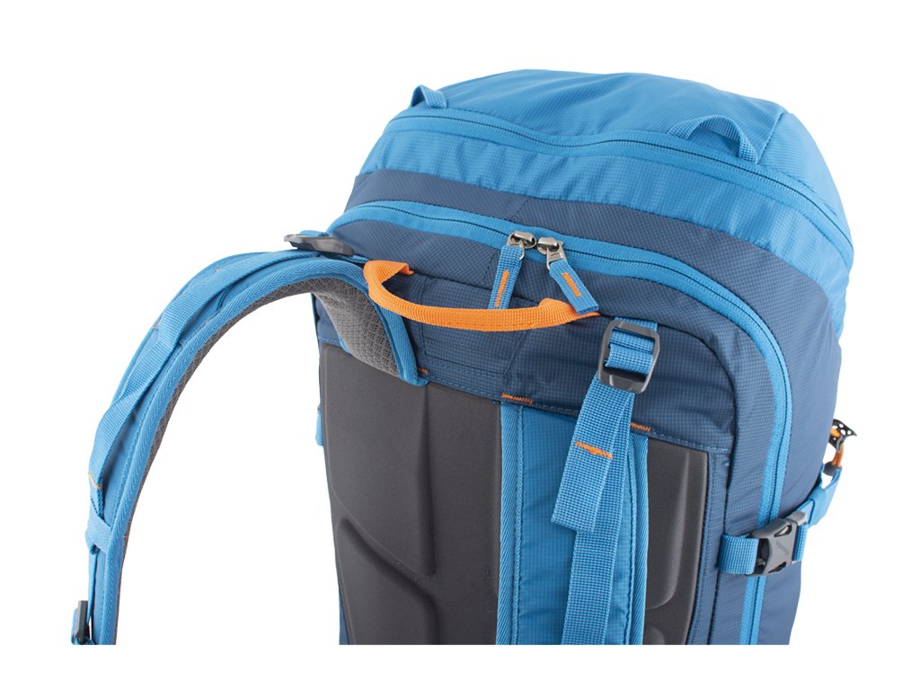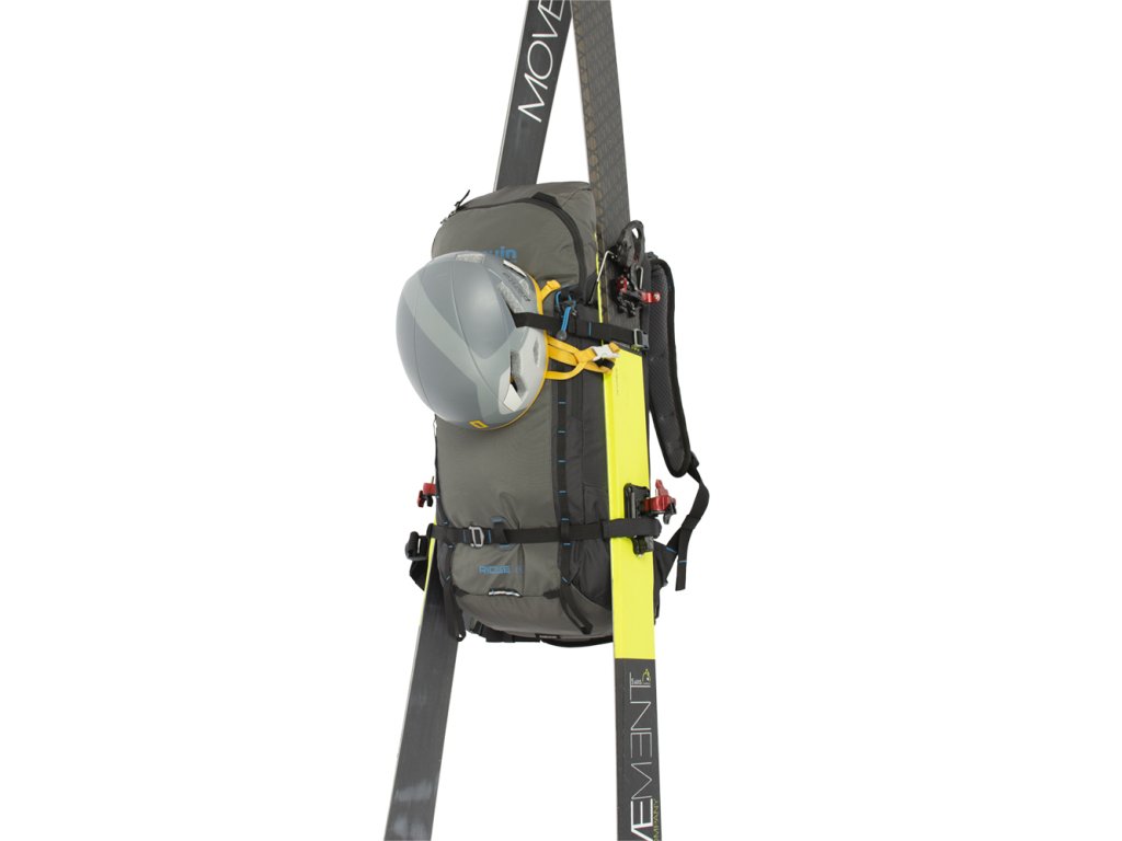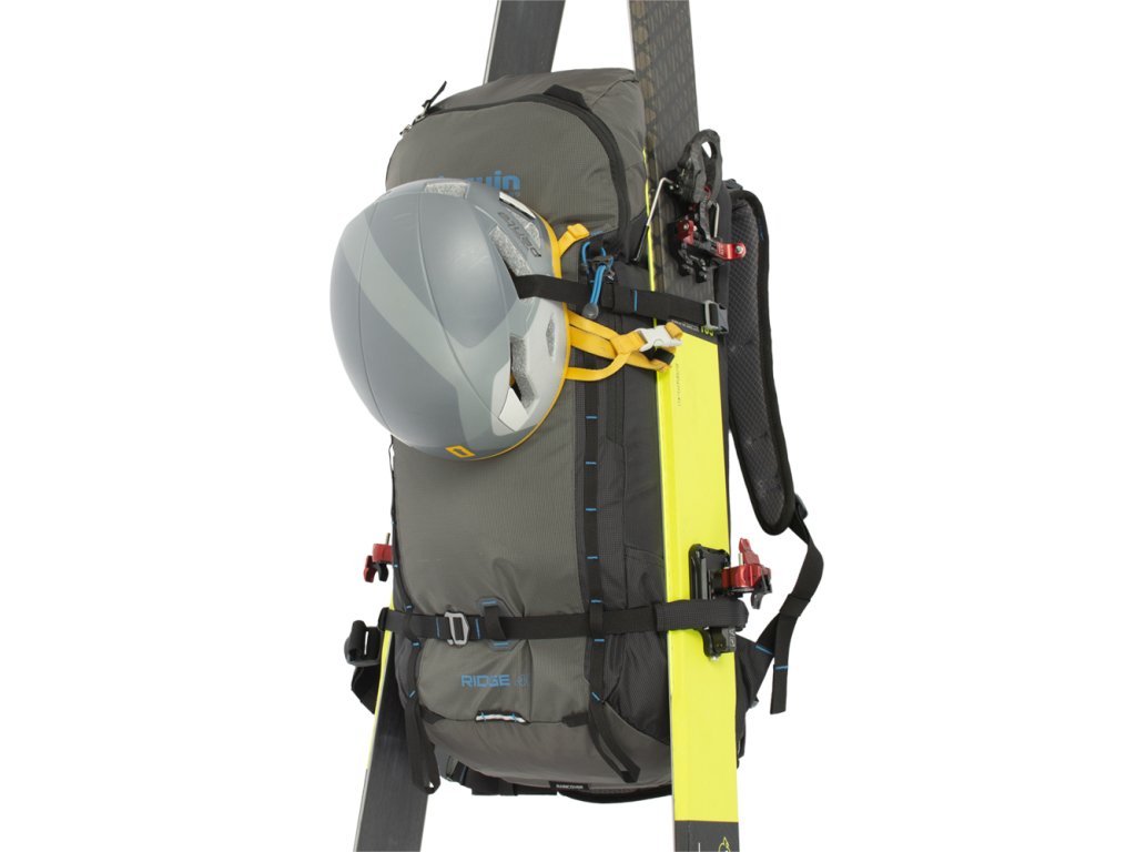 - Odolné kovové háčky a Hypalonem podložená poutka na čele batohu k diagonální fixaci lyží.