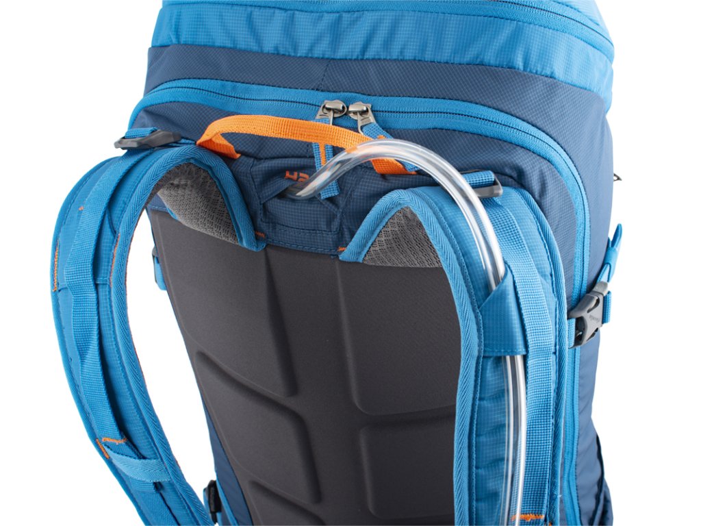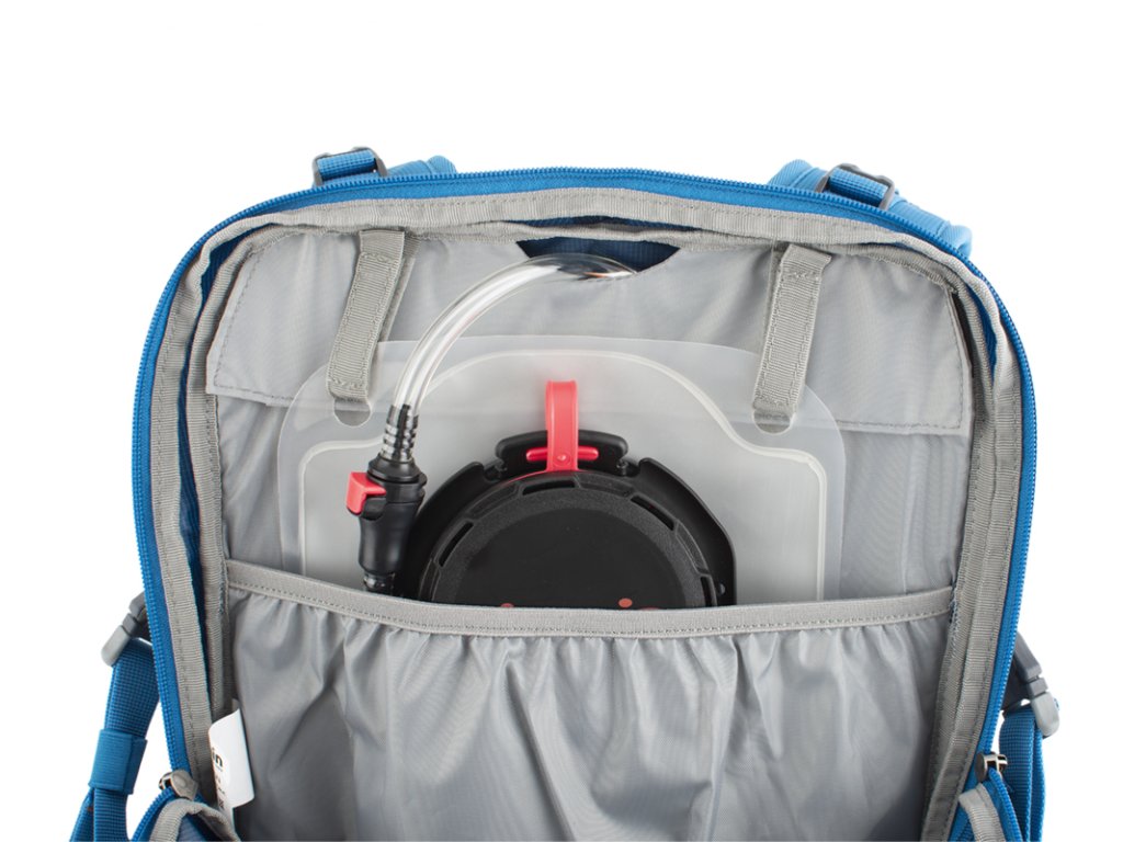 Výstup na hadici vodního vaku v horní části batohu mezi ramenními popruhy. Uvnitř hlavní komory se nachází přepážka oddělující vodní vak od dalšího převáženého vybavení.