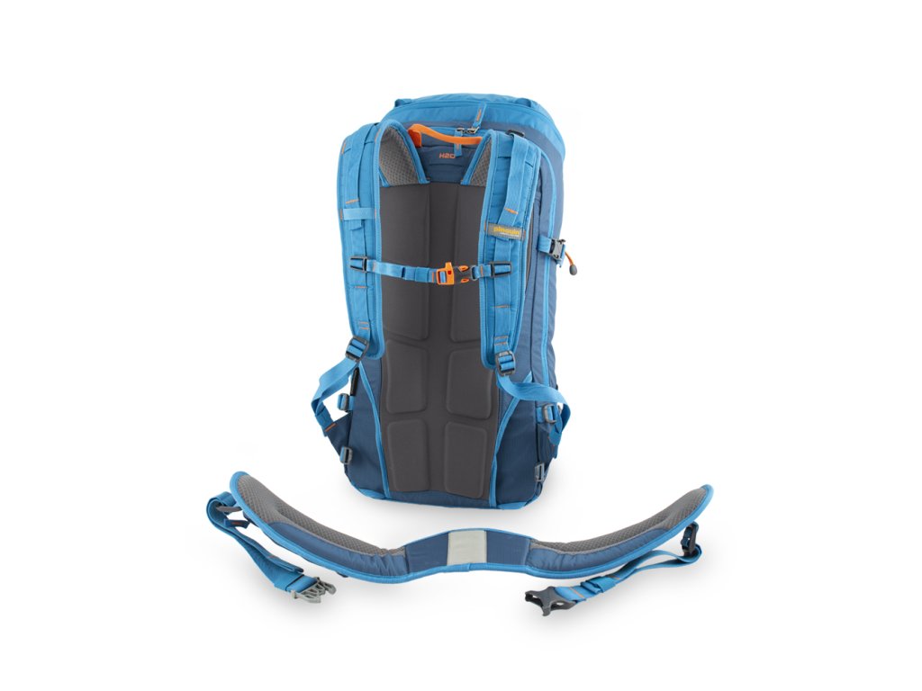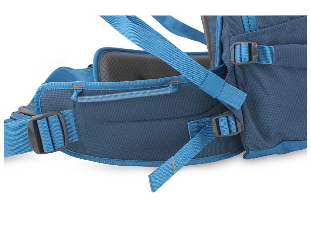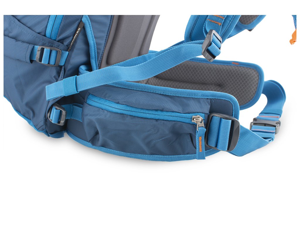 Odnímatelný, solidně polstrovaný bederní pás s bočními balančními popruhy a širokým popruhem s boční regulací pro jeho snadné dotažení. Zipová kapsa na pravé straně bederního pásu, poutko na karabiny nebo lyžařské mačky na jeho levé straně.