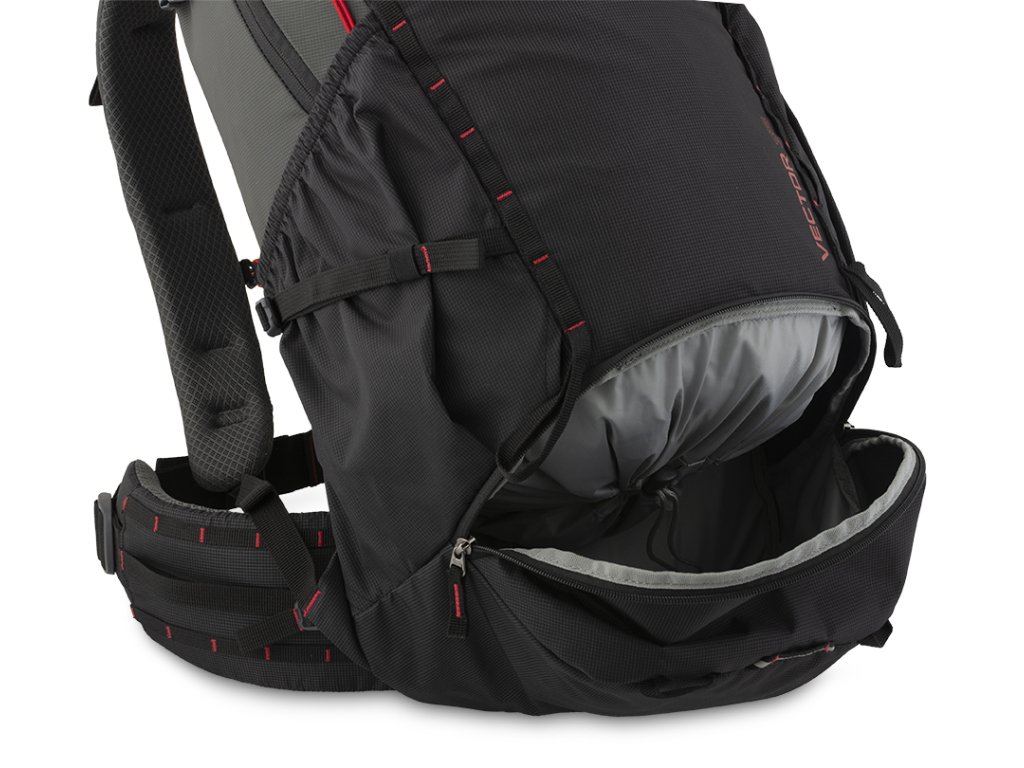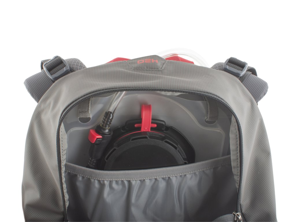 Prostorná čelní zipová kapsa vhodná k uložení rychle dostupného vybavení s vnitřní síťovanou zipovou kapsou na cennosti s karabinkou na klíče. Vodní vak, ramenní popruhy a bederní pás.