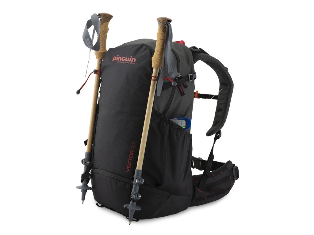 Pružná poutka s háčky na připevnění teleskopických holí a poutka na dně batohu.