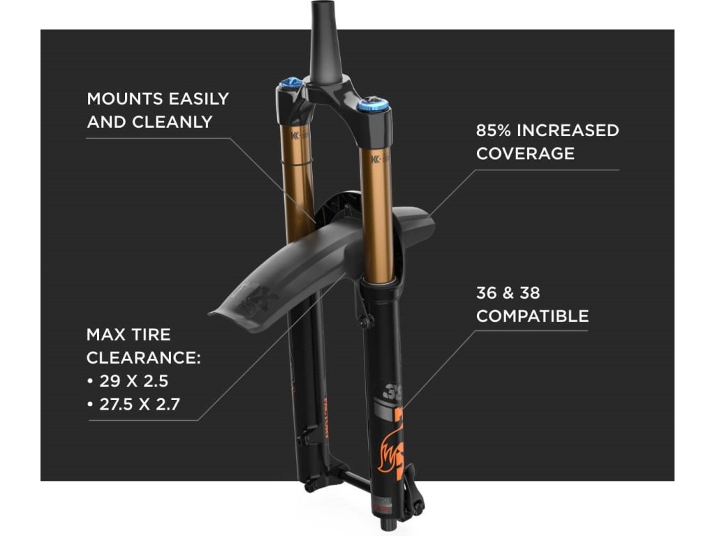 Nový prodloužený XL blatník se čtyřbodovým uchycením pro přední odpružené vidlice FOX 36 a 38 od modelové řady 2021