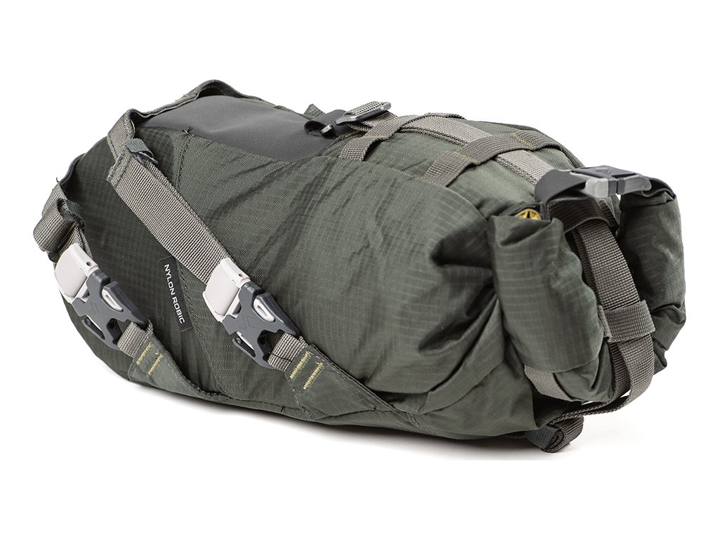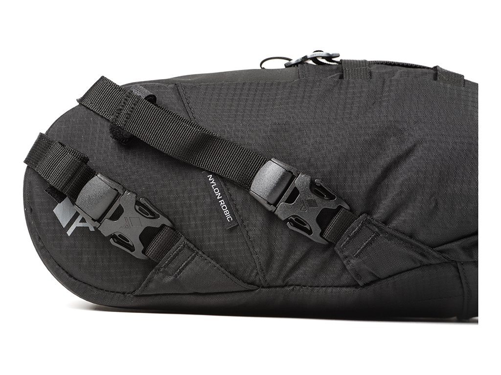 Použitý nový hlavní materiál Nylon Robic (PU zátěr 1500 mm H20) je velmi odolná a lehká tkanina. Na dno brašny a exponovaná místa, kde se brašna dotýká sedlovky a sedlových vzpěr, jsme použili otěruvzdorný a nesmekavý Hypalon. Uvnitř brašny se nachází vyjímatelná vodotěsná vložka (zátěrovaná Nylon RipStop textilie, PU 5000 mm s podlepenými švy), která zaručeně udrží převážený obsah brašny v suchu.