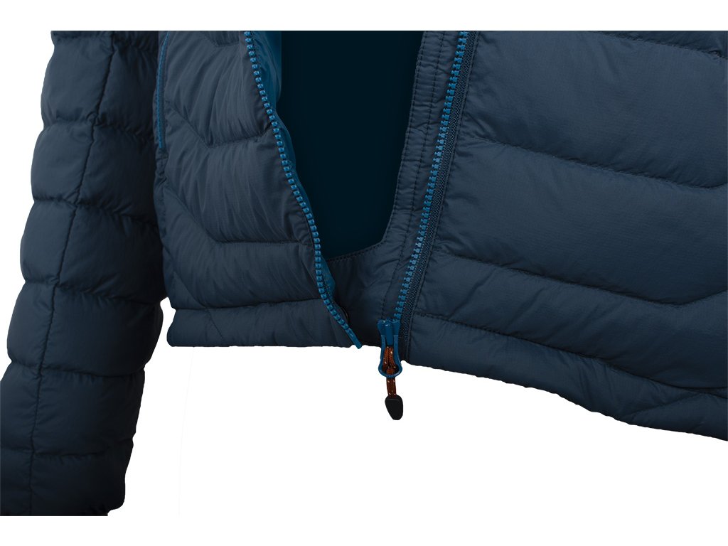 Jedním z nejlepších přírodních izolantů je prachové peří. Právě kachním prachovým peřím plníme bundy Hill, a to s hustotou 650 cuin. Prachové peří je smícháno s malými pírky v poměru 90/10 - to proto, že malá pírka jsou pružná a pomáhají udržovat nadýchanost materiálu (tzv. loft). Použité peří splňuje certifikaci RDS a je náležitě vyčištěno, takže nehrozí žádný zápach, který si pamětníci s kachním peřím spojují. Navíc je opatřeno tzv. teflonovou úpravou, zvyšující jeho výkon ve vlhkých podmínkách a přispívající životnosti.