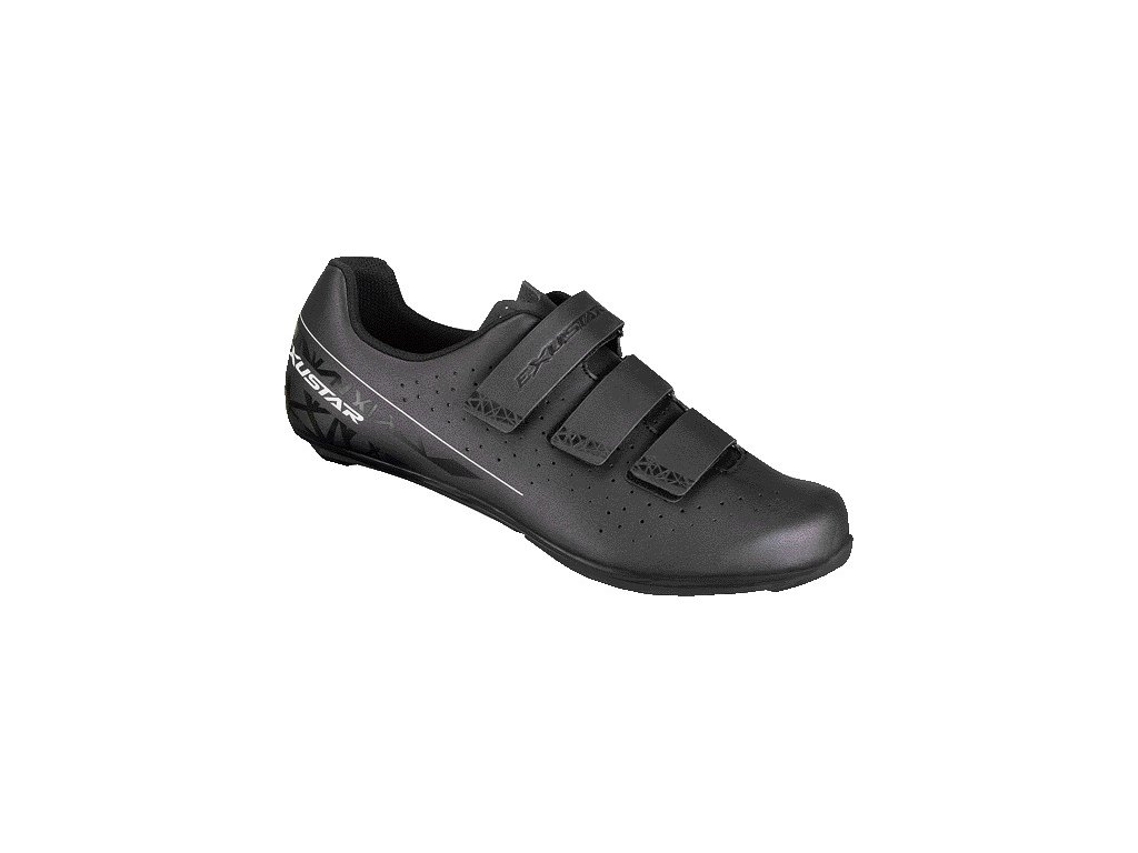 Sportovní silniční tretry Exustar. Tvarovaný, pohodlný svršek z PU kůže s prodyšnou síťovinou a pásky na suchý zip. Kompozitní podešev z nylonu a skleněných vláken má vestavěné ventilační otvory Air Control, které vás udrží v chladu, a protiskluzové vycpávky jsou připraveny, když se vaše nohy dotknou země.