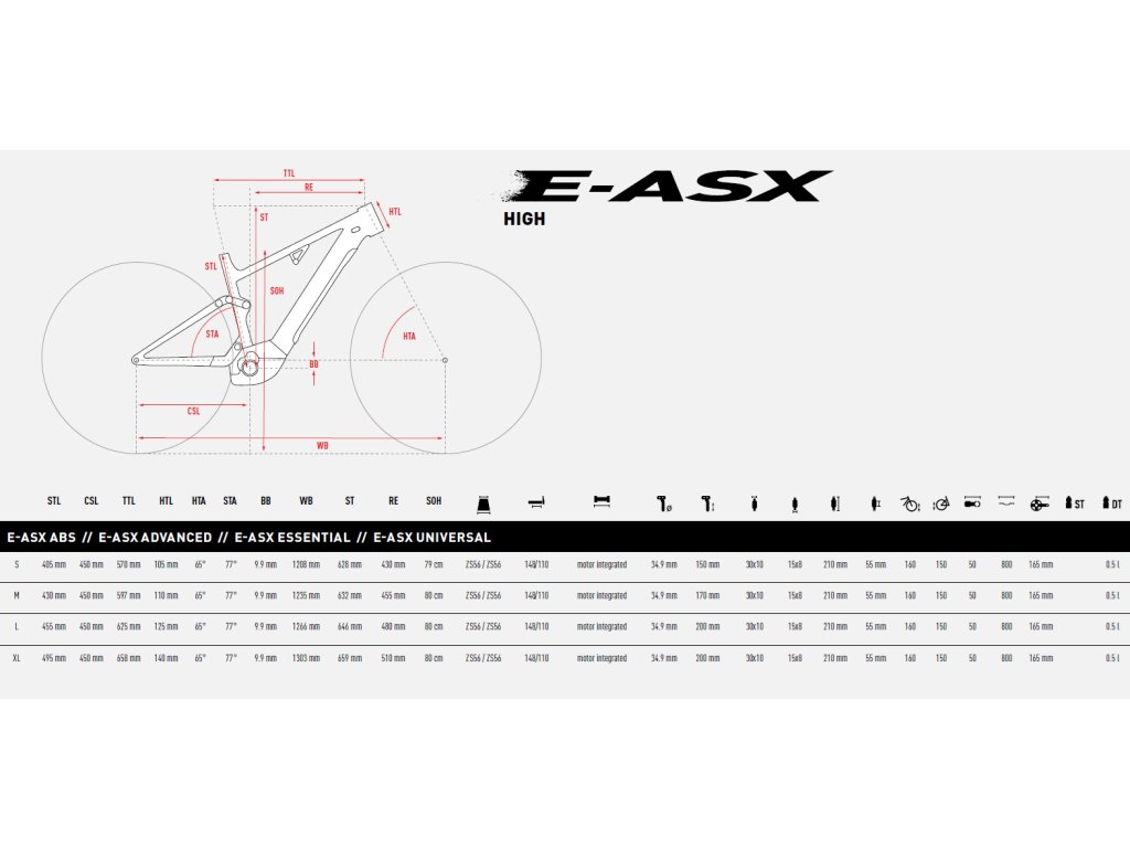 E-ASX spojuje moderní geometrii s hliníkovým rámem a nabízí dokonalou rovnováhu mezi tuhostí a hmotností. S nosností až 150 kg je GHOST E-ASX připraven na všechna multi-sportovní dobrodružství. Progresivní kinematika s až 160 mm zdvihu vpředu a 150 mm vzadu zajišťuje výbornou trakci a komfort v náročném terénu. Kromě klasických modelů s vysokým nástupem jsou v nabídce i unikátní sportovní modely s nízkým nástupem (Low) a odpružením 140/130 mm – tyto rámy umožňují pohodlnější nástup a zároveň zachovávají pravý výkon e-MTB. Verze EQ jsou vybaveny blatníky, nosičem, osvětlením a stojanem – ideální pro dlouhé výlety, každodenní dojíždění nebo náročné cestování. Všechny High modely jsou dodávány jako mullet tzn.: 29“ kolo vpředu a 27,5“ vzadu.