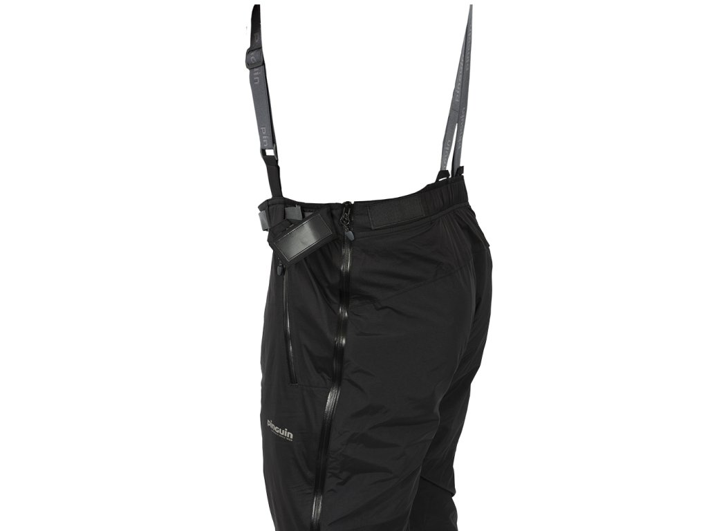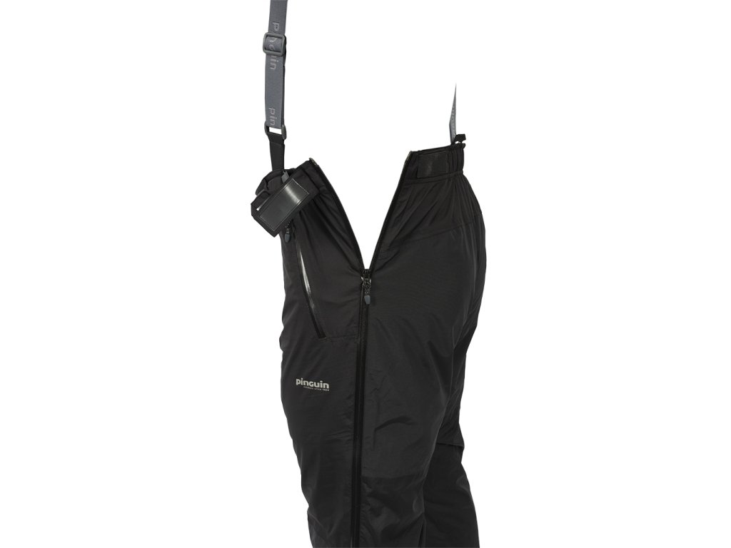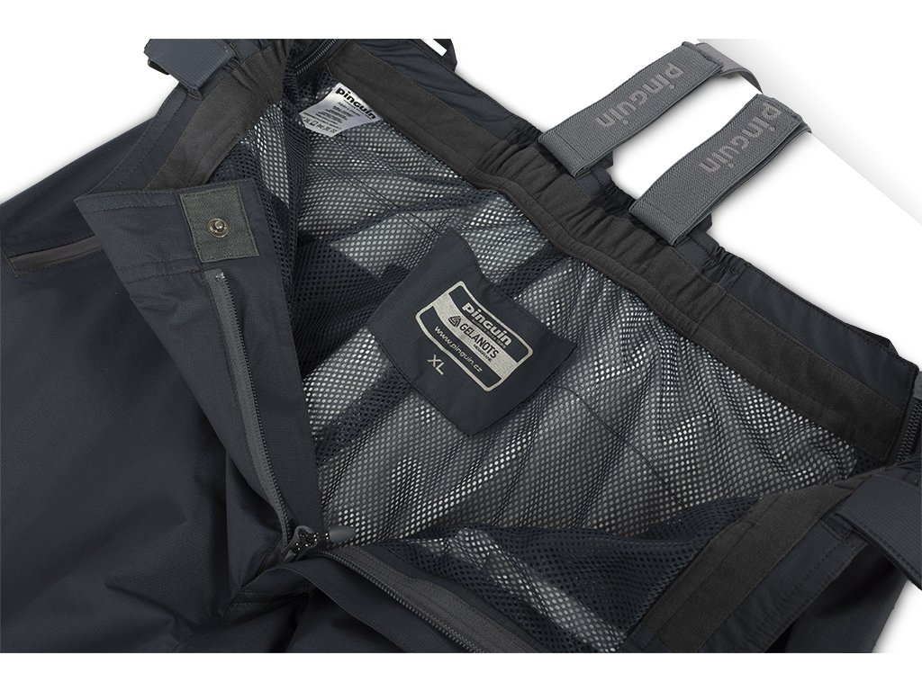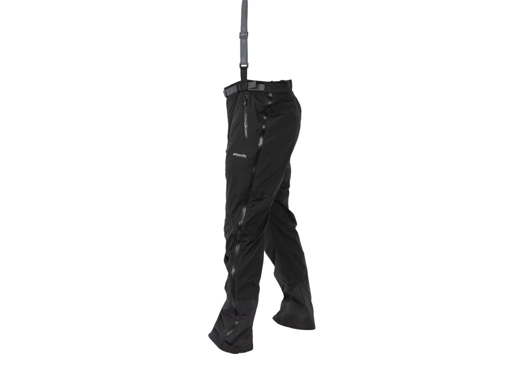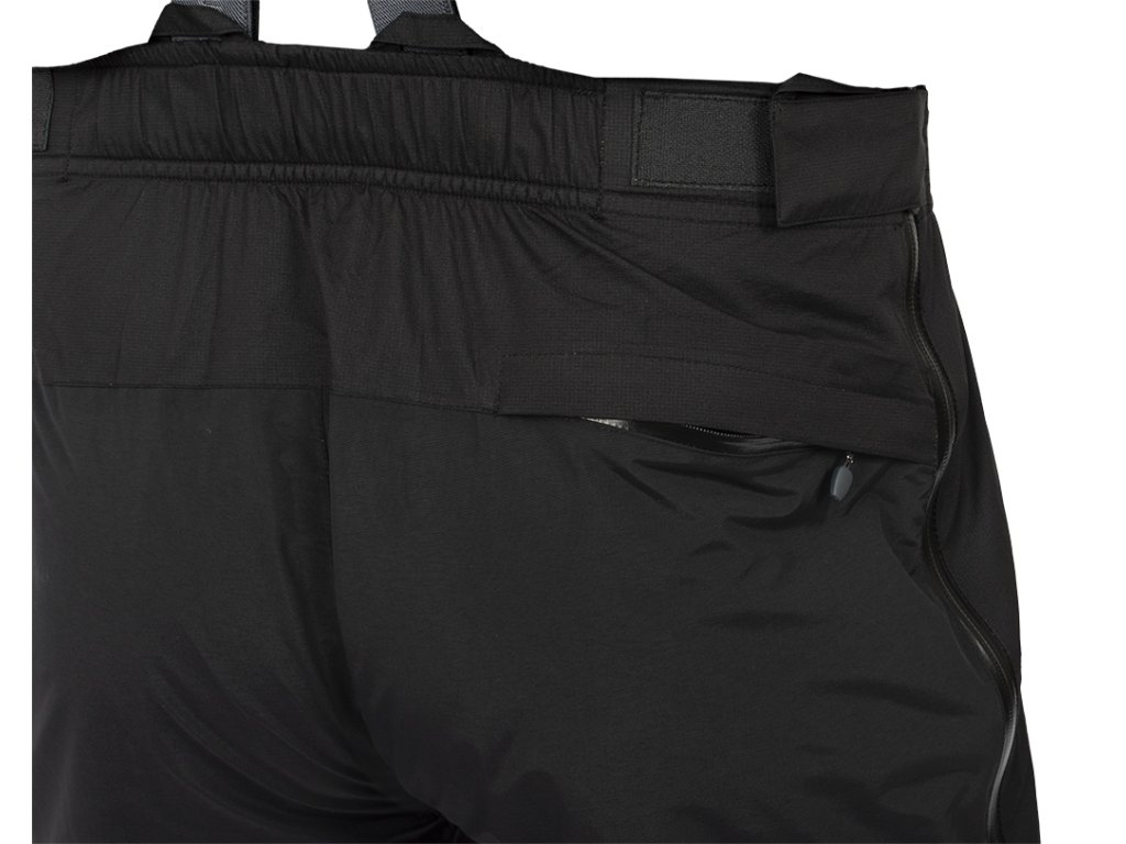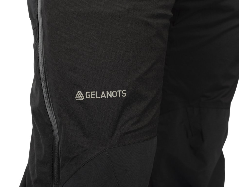 Dvouvrstvý laminát s japonskou membránou Gelanots, řezaný laserem, se stoprocentním podlepením veškerých švů, vás udrží v suchu, ať už budete vystaveni dešti, větru, nebo se zpotíte při namáhavém výstupu. Nohavice je možné rozepnout po celé jejich délce, jsou vybaveny dvoucestnými otevřenými YKK Waterproof zipy - to znamená, že mají dva protisměrné jezdce a dají se úplně rozepnout jak nahoře, tak dole. Na obou těchto místech samozřejmě nechybí pojistné suché zipy. Vyztužení exponovaných partií zvyšuje jejich odolnost vůči oděru. Kapsy jsou rovněž opatřeny zipy YKK Waterproof. Šle jsou připevněny pomocí suchých zipů, takže se dají jednoduše odepnout.