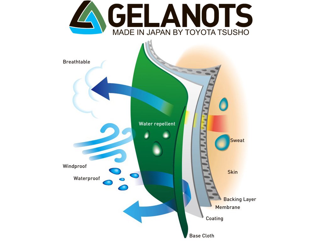 Dvouvrstvý laminát s membránou Gelanots s vysokou pružností se pyšní vodním sloupcem celých 20 000mm a prodyšností 25 000g H2O/m2. To v jednoduchosti znamená, že když si například kleknete do bláta, přičemž budeme počítat, že styková plocha měří 10cm2, můžete vážit i 200kg a membrána neproteče. Dvouvrstvý laminát pak znamená jednoduše, že membrána je slisována společně se svrchní látkou (Nylon 6.6) a ochranu před mechanickým poškozením jí zevnitř poskytuje síťovaná podšívka.