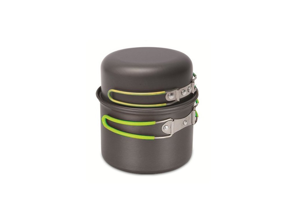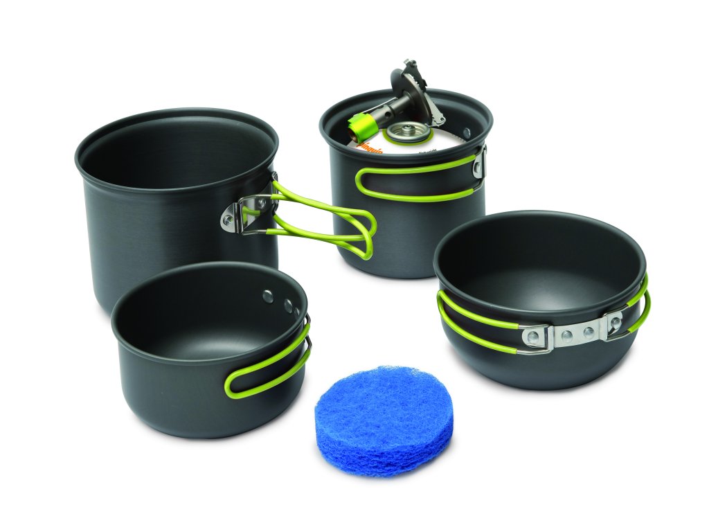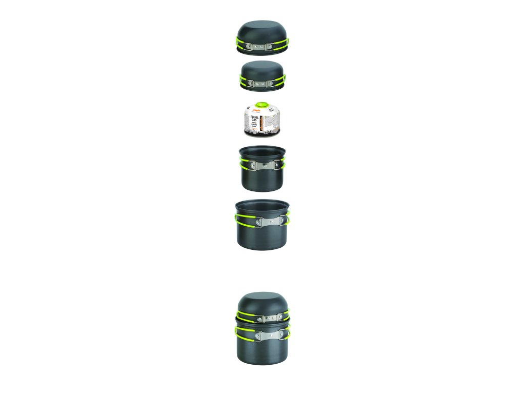 Kartuše, vařič ani utěrka nejsou součástí balení. Set dodáváme v síťovaném přepravním obalu a s houbičkou na mytí nádobí.