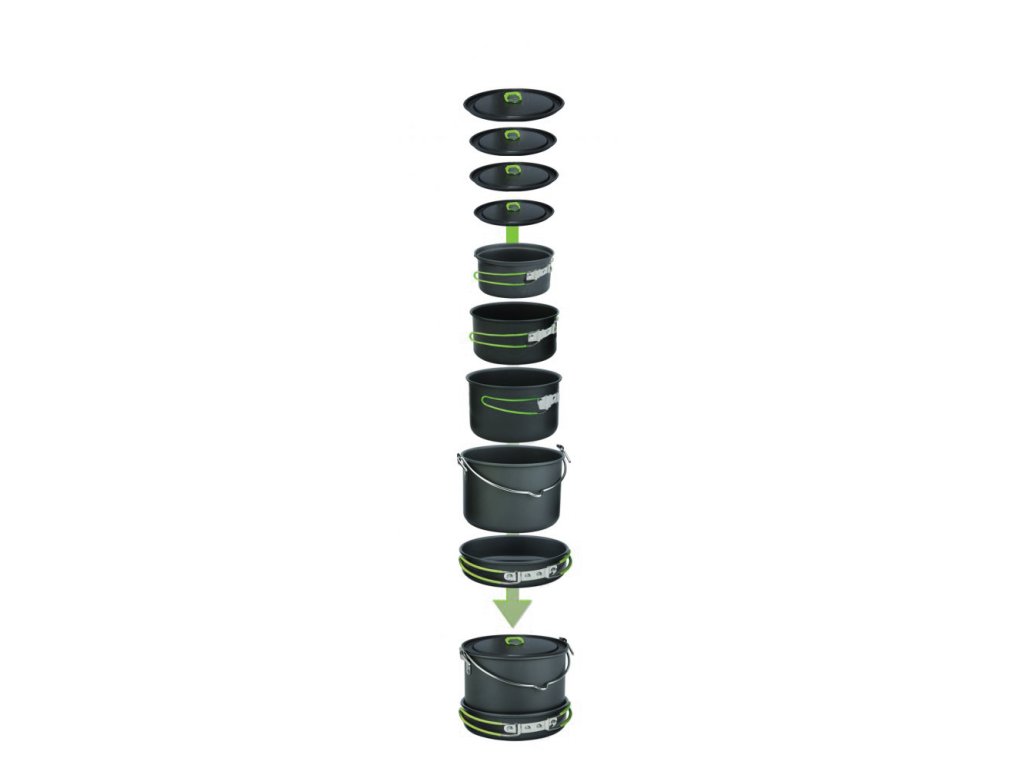 Set campingového nádobí vyrobený z hliníku s anodizovaným povrchem. Sklopné rukojeti jsou vyrobeny z ocelového drátu, opatřeného silikonovou žáruvzdornou bužírkou, rukojeti poklic jsou plastové.