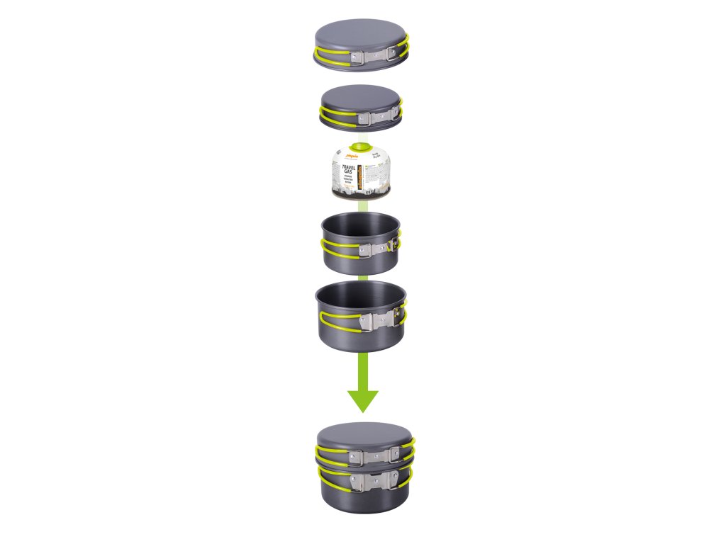 V malém hrnci lze pohodlně přenášet buďto příslušenství nebo 230g kartuši. Současně je zde místo i pro malý plynový vařič, utěrku a houbičku na nádobí. Toto vybavení není součástí balení. Set je dodáván v síťovaném přepravním obalu.
