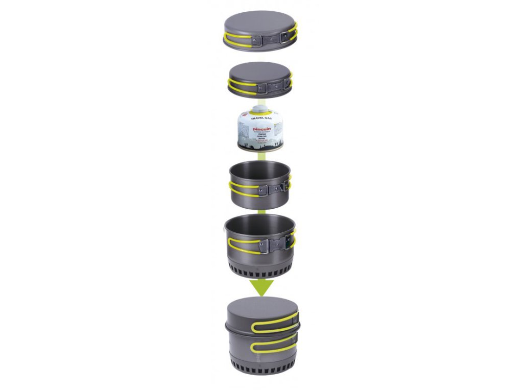 V malém hrnci lze pohodlně přenášet 230g kartuši, malý plynový vařič, utěrku a houbičku na nádobí. Toto příslušenství není součástí balení. Set je dodáván v síťovaném přepravním obalu.