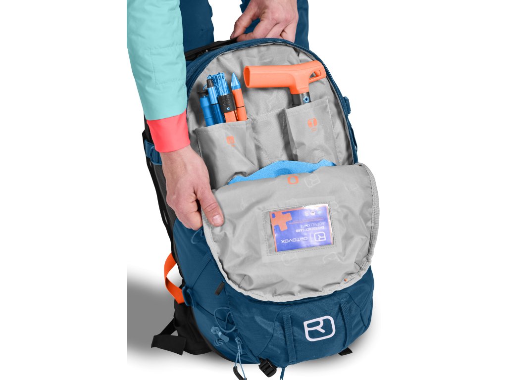 Hlavní kapsa má nepromokavý dvoucestný zip, který se dá dostatečně otevřít a vše vidíš hned a přehledně. Vnitřní prostor je světlý pro lepší orientaci za šera. Na čele batohu se nachází speciální kapsa na lavinovou výbavu, v případě potřeby budeš mít lopatu a sondu hned po ruce. Uvnitř hlavní kapsy je ještě spona na rezervoár vody. Vpředu je malá kapsa na mapu, buzolu a další navigační vybavení. V této kapse je také plastová karabinka na klíče.