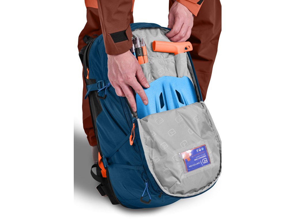 Hlavní kapsa má nepromokavý dvoucestný zip, který se dá dostatečně otevřít a vše vidíš hned a přehledně. Vnitřní prostor je světlý pro lepší orientaci za šera. Na čele batohu se nachází speciální kapsa na lavinovou výbavu, v případě potřeby budeš mít lopatu a sondu hned po ruce. Uvnitř hlavní kapsy je ještě spona na rezervoár vody. Vpředu je malá kapsa na mapu, buzolu a další navigační vybavení. V této kapse je také plastová karabinka na klíče.