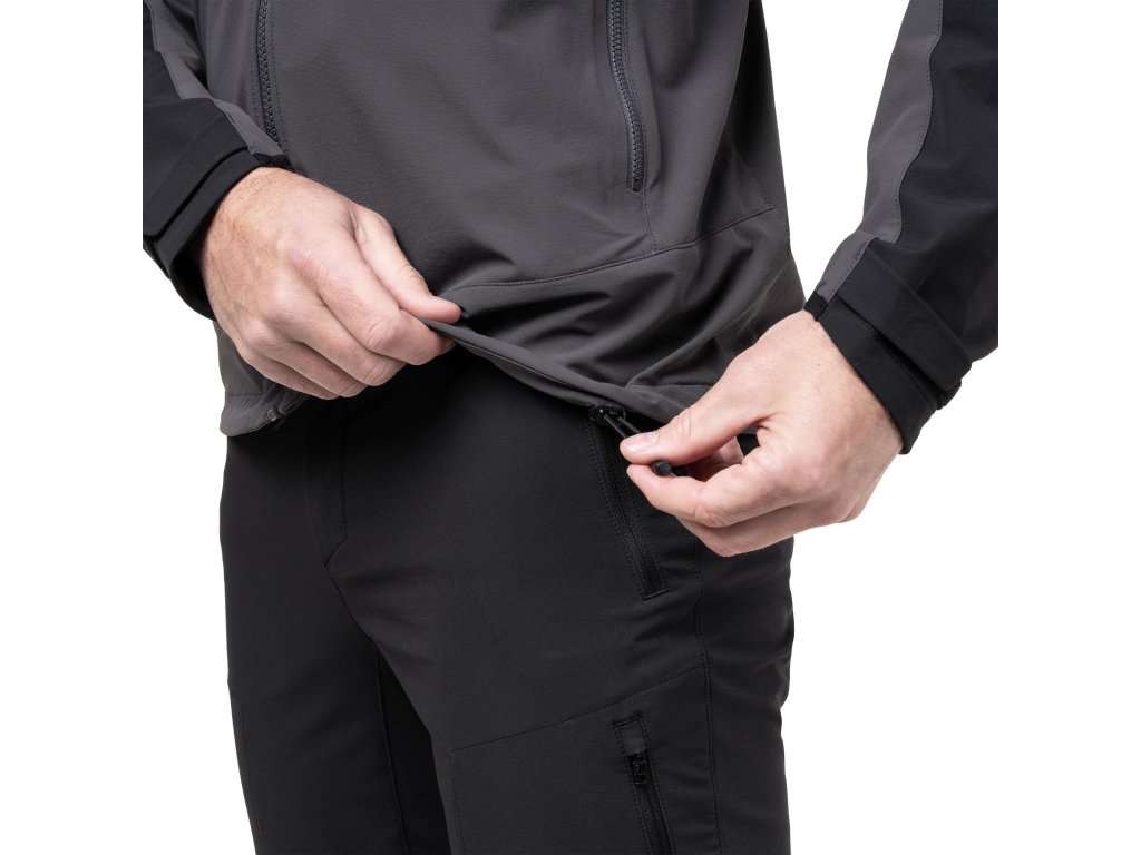- Stahování spodního lemu bundy. Samostatná šňůrka pro stahování přední a zadní části, aby nehrozilo zachycení do karabiny, když si ji připínáš na materiálové oko sedacího úvazku.
