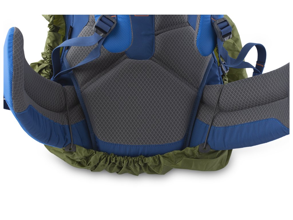 Upínání na batoh je řešeno pomocí obvodové pruženky s brzdou. Zajištění pomocí pruženky za bederní pás.