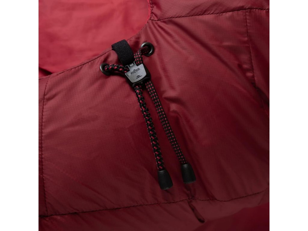 - 3D kapuce bez nutnosti stahování – kapuce je tvarovaná tak, aby chránila hlavu i bez stahování. 5 komor zabrání migraci peří, chrání hlavu před ztrátou tepla a tím ti zabezpečí příjemný spánek. Pokud potřebuješ kapuci stáhnout, není problém. Podle tvaru šňůrky přesně víš, jestli stahuješ horní část kapuce (plochá šňůrka), nebo spodní část kapuce (kulatá šňůrka).
