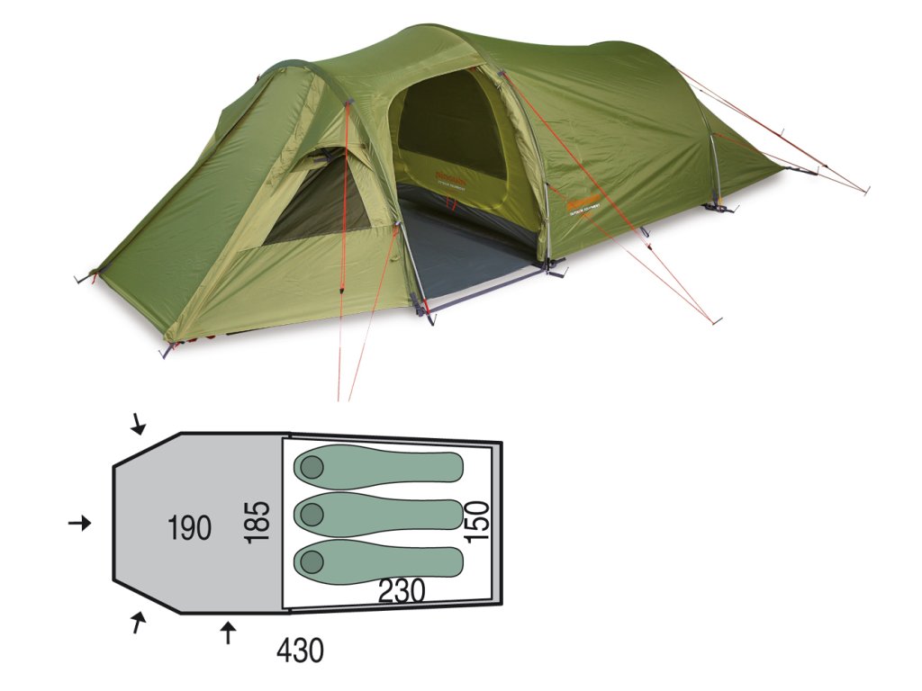 Velmi prostorný stan tunelového typu, vhodný i do horších povětrnostních podmínek, díky svému nízkému profilu.