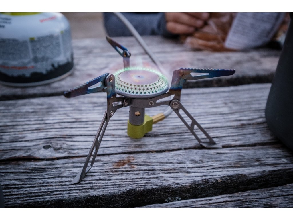 Široký hořák o příkonu 3000W, také vyrobený z titanu, rozprostírá plamen po celé ploše dna hrnce a optimalizuje účinnost vařiče. Spojení vařiče s kartuší hadičkou s ocelovým opletem umožňuje využít kartuši až do posledního zbytku.