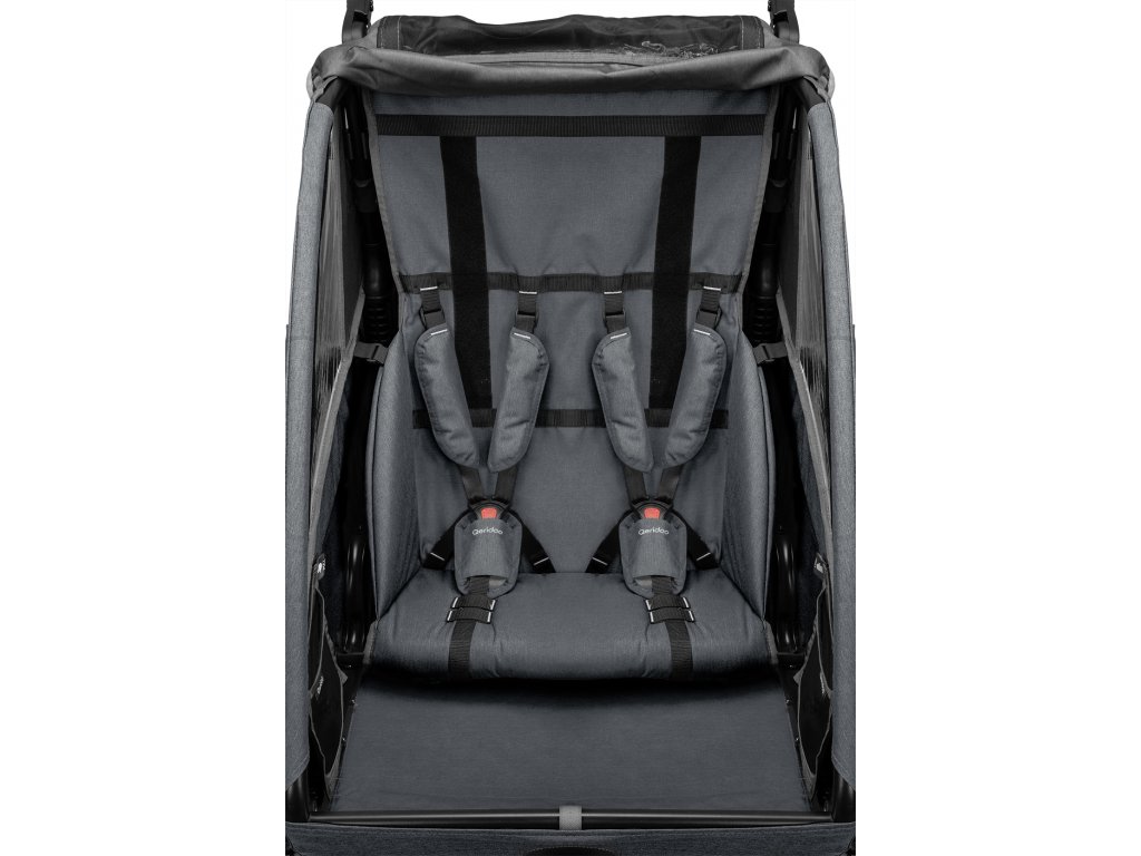 Dvoumístný odpružený dětský vozík za kolo Qeridoo Qupa2. Nabízí komfortní sedadla s adaptivním 5-bodovým pásem a kočárkové kolečko Multiwheel s funkcí aretace. Doporučujeme pro děti s maximální výškou 116,5 cm.