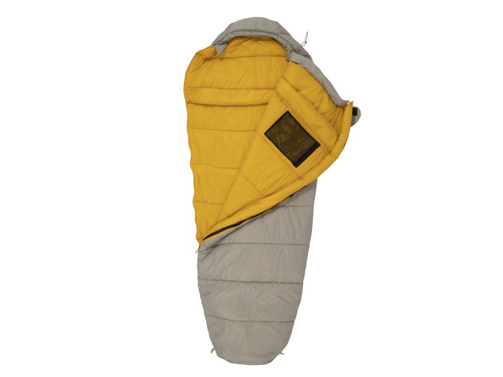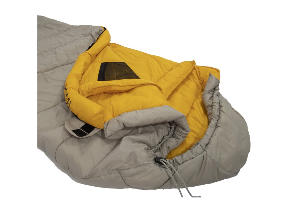 Zapínání: spacák je vybaven značkovým zipem YKK se speciálním plastovým chráničem, který zabraňuje vniknutí látky do jezdce a samovolnému rozepínání. U hlavy je zip ještě zajištěn klopou na suchý zip, která zamezuje samovolnému otevření zipu.